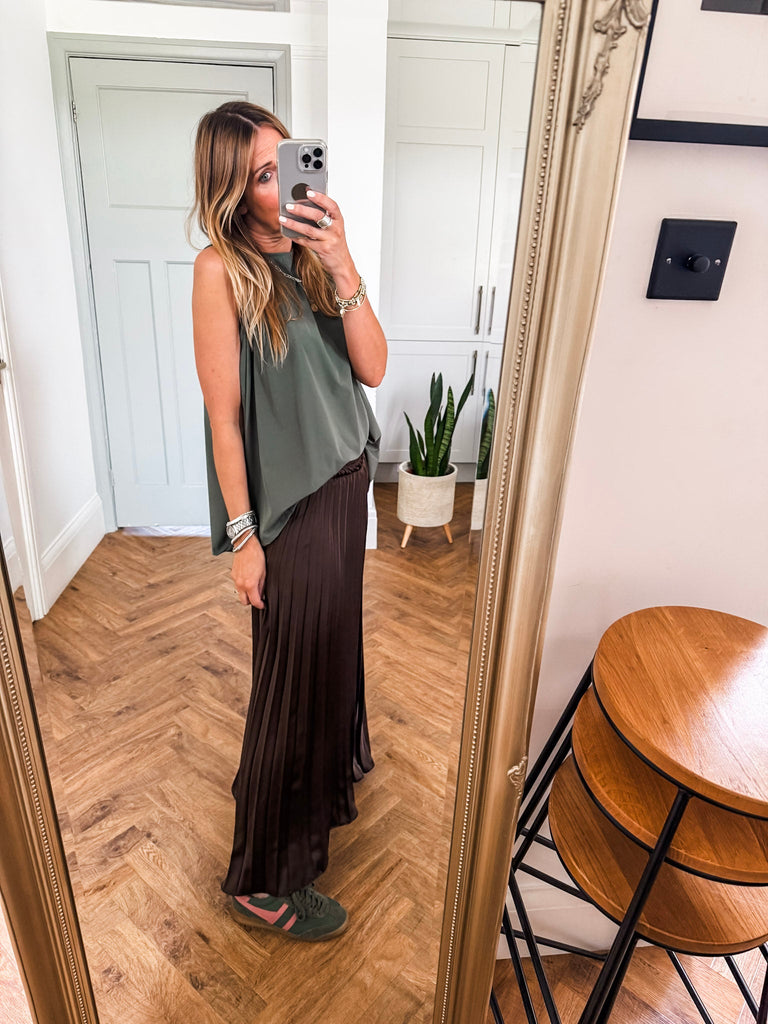 The combo of a sweatshirt, crossbody bag and runner trainers keeps this look cool and causal. Create a head-to-toe sequin look by pairing this skirt with the matching top.