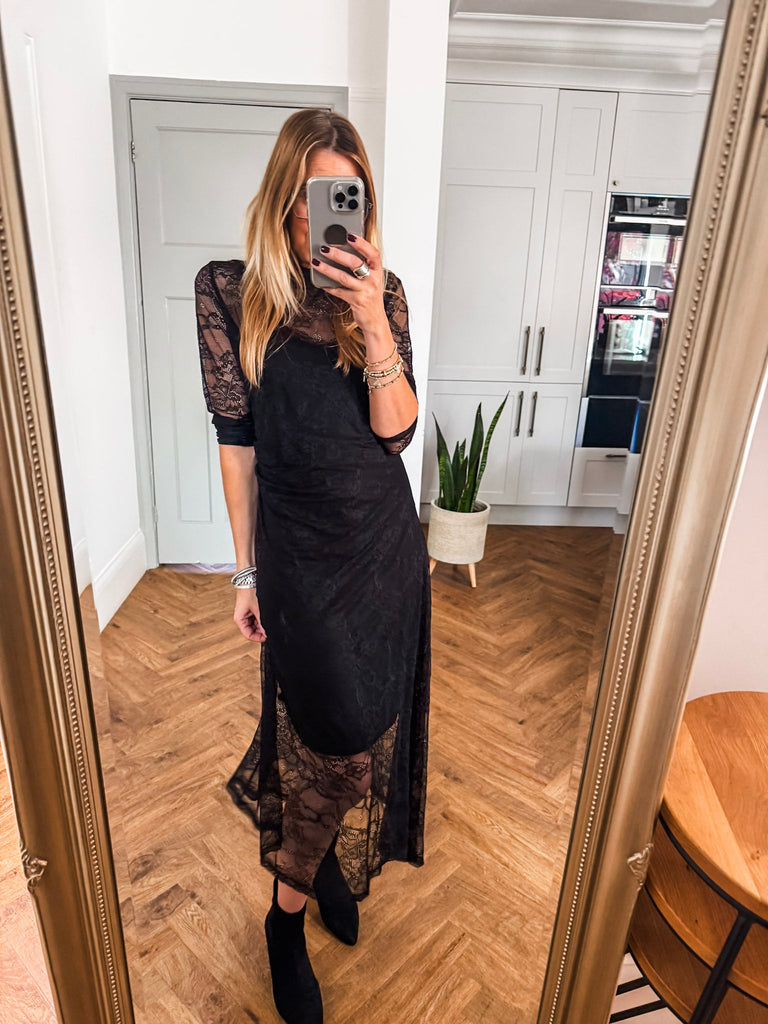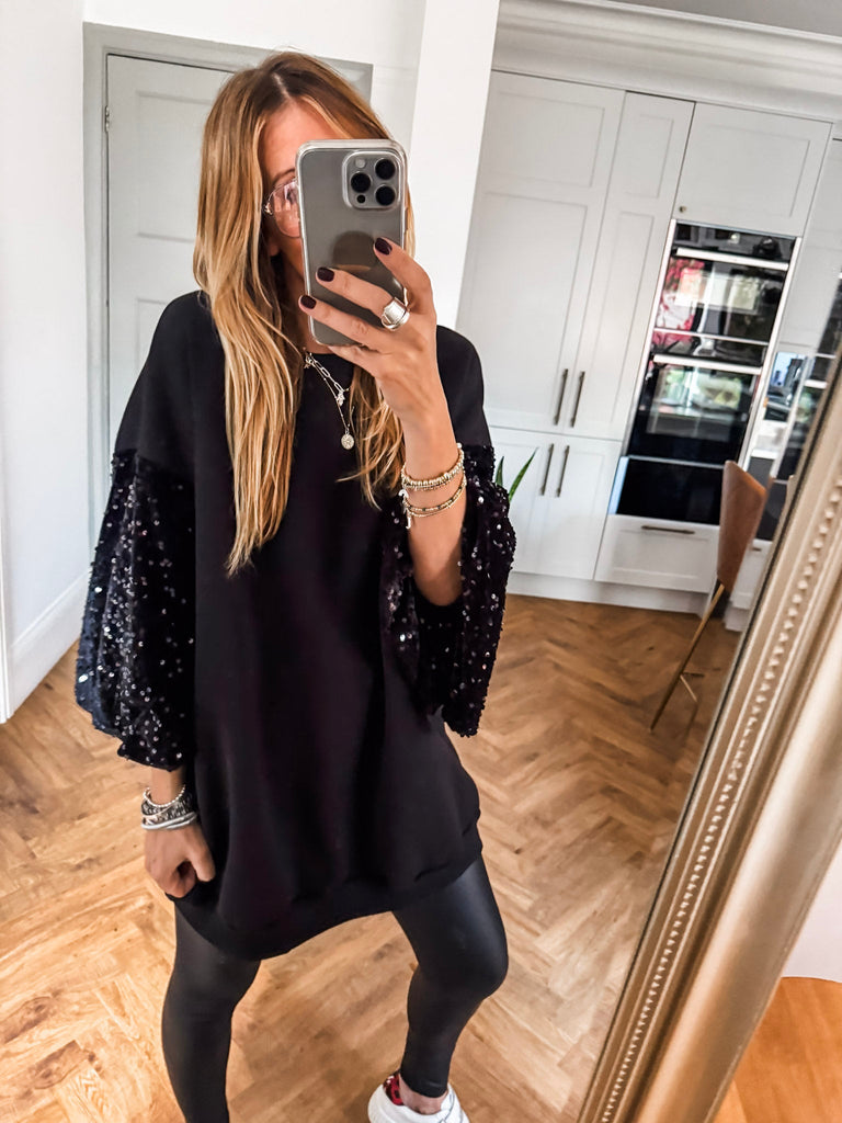 The black jacket tones down the sparkly sequins with the trainers keeping things casual for this daytime look. Then slip into some faux leather trousers for an elevated evening outfit.
