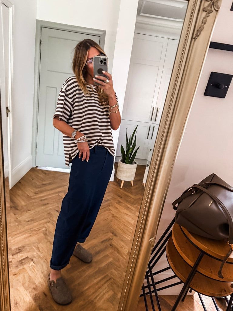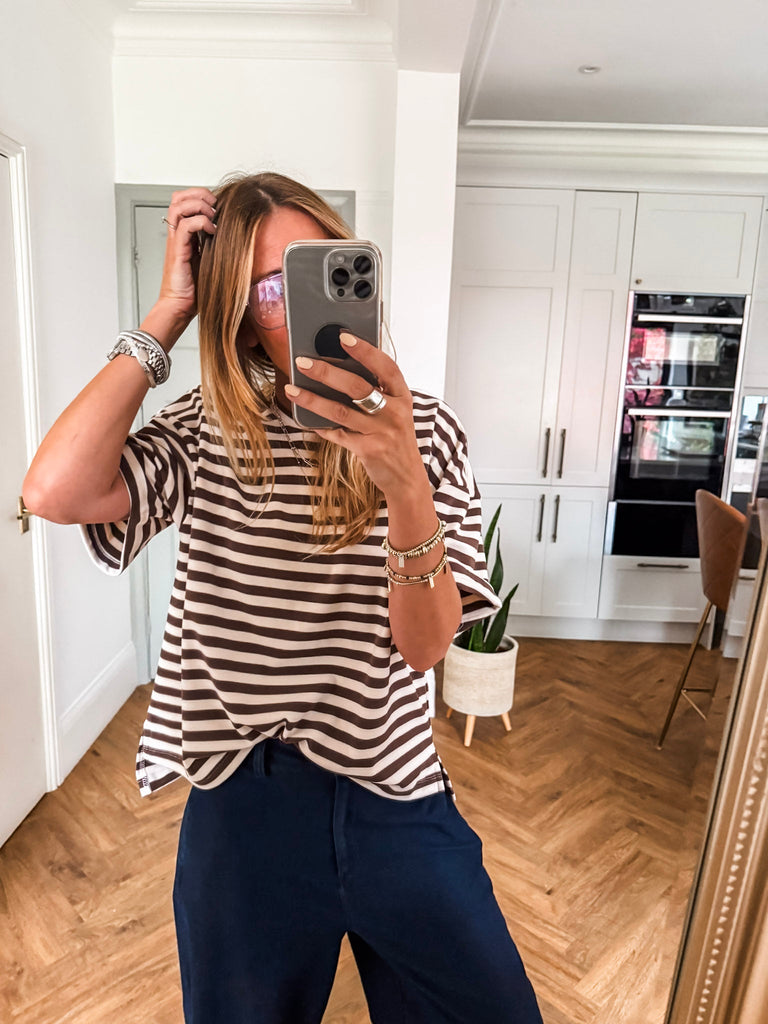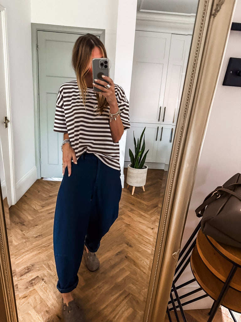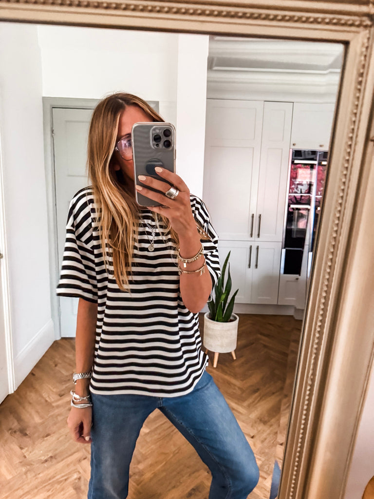 Tuck it into wide-leg trousers with loafers for an elevated everyday look, or pair with denim and trainers for easy off-duty style. Layer it under a blazer for a polished twist, or over a slip skirt for relaxed contrast. Its timeless stripe makes it endlessly versatile across seasons.