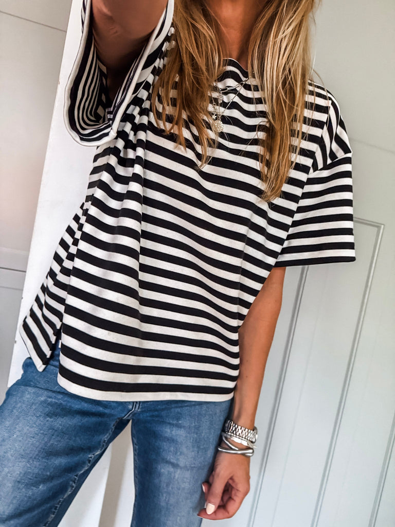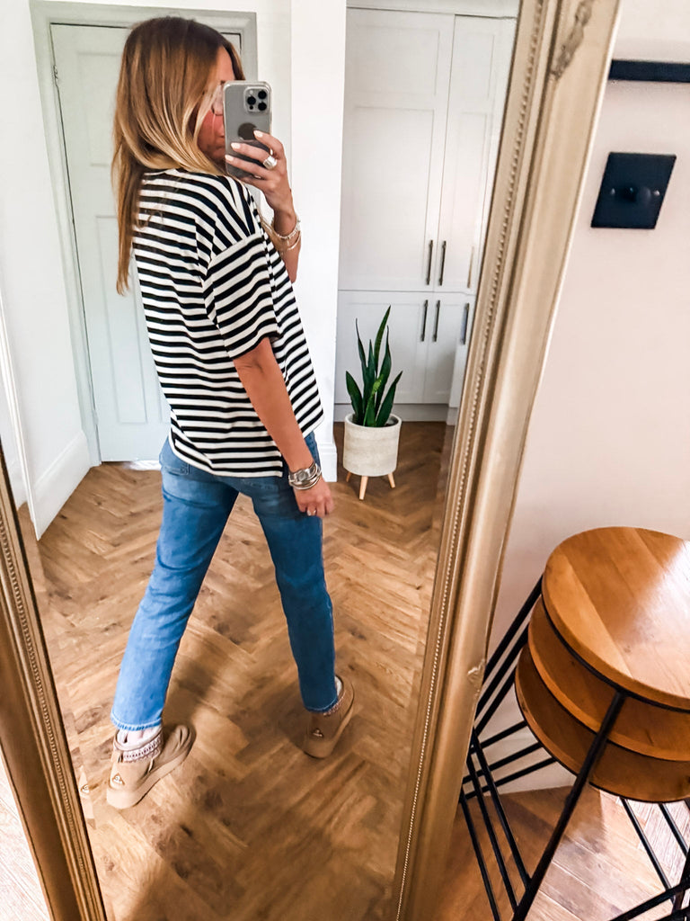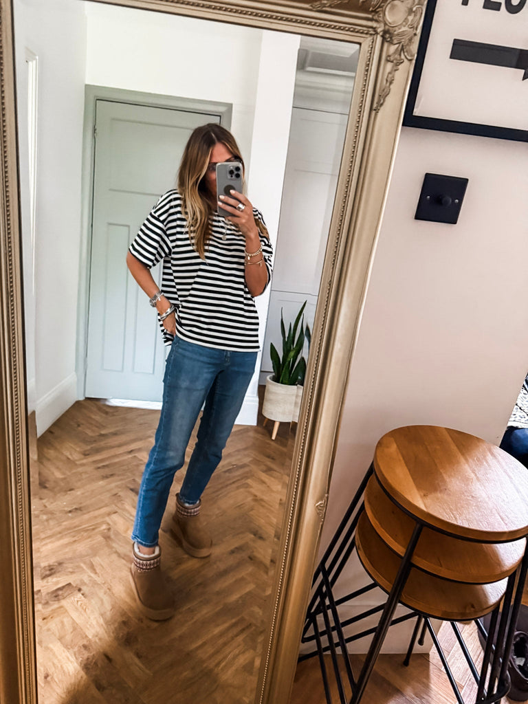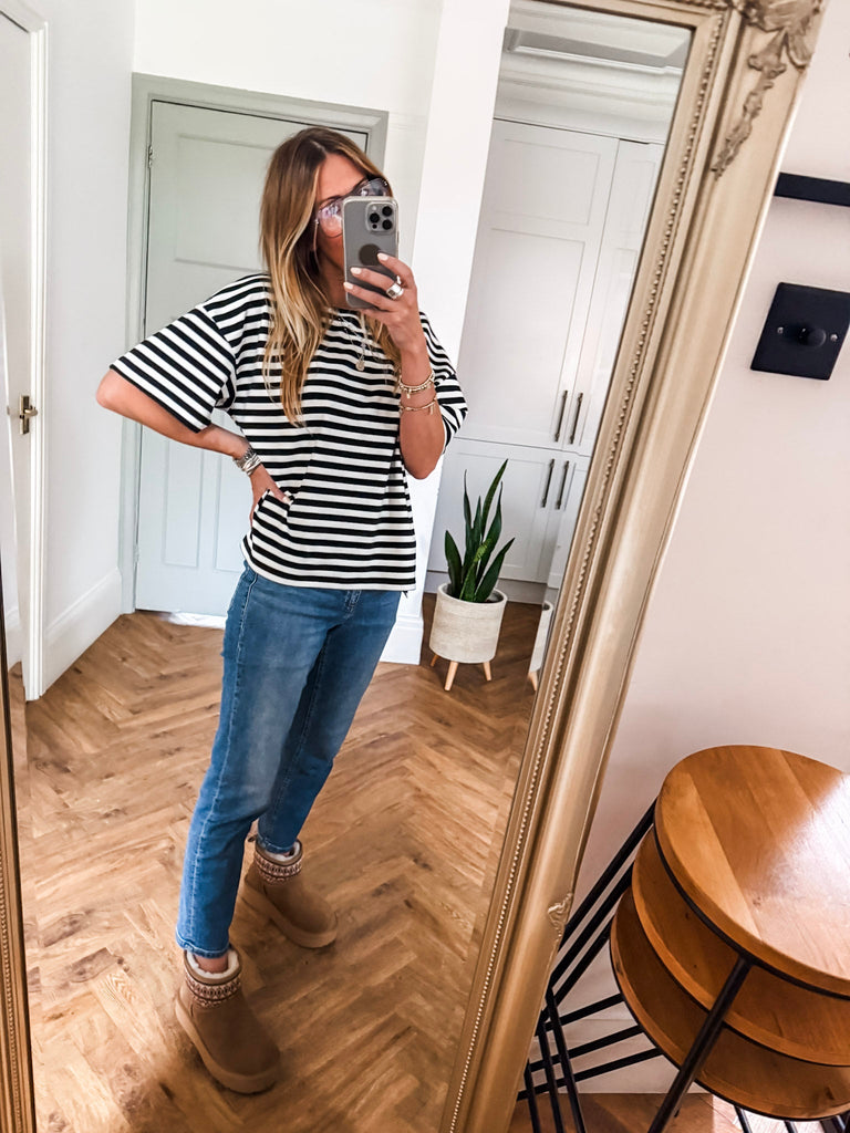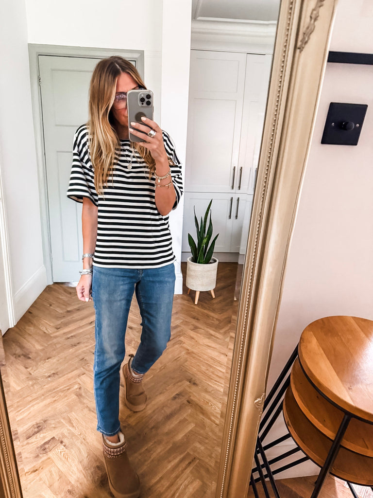 Tuck it into wide-leg trousers with loafers for an elevated everyday look, or pair with denim and trainers for easy off-duty style. Layer it under a blazer for a polished twist, or over a slip skirt for relaxed contrast. Its timeless stripe makes it endlessly versatile across seasons.