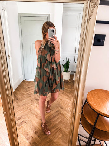 Step into effortless style with this bottle green dress and brown polka dots. Crafted from a lightweight, flowy fabric, it features a sleeveless, loose-fitting silhouette that drapes beautifully for all-day comfort. The high neckline is accented with a delicate front ruffle and a tie-back bow, adding a touch of elegance to its playful design. Perfect for warm days or layered looks, this dress strikes the perfect balance between fun and sophistication.