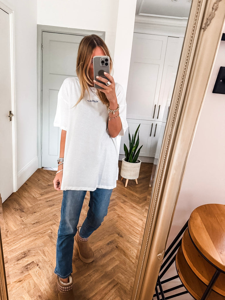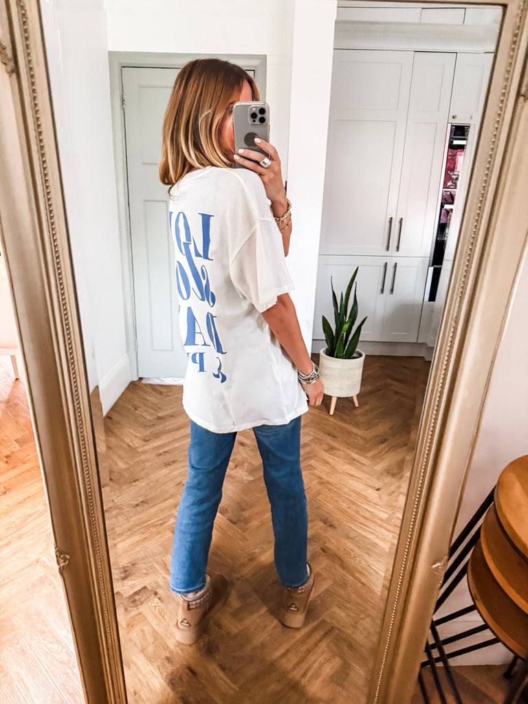 Style the Kamille T-Shirt with relaxed jeans or biker shorts for an easy, off-duty look. Layer it under an oversized blazer or denim jacket to add structure to the laid-back fit. Finish with chunky sneakers or slides for effortless weekend style.