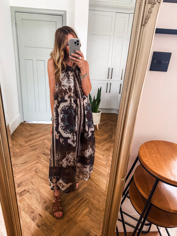 Turn heads in this sleeveless maxi dress, featuring a bold print and flattering round neckline. Its flowing silhouette brings comfort and ease to warm days. Effortlessly cool and perfect for casual outings or laid-back moments.