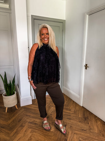 Add a lace, artistic edge to your autumn look with this sleeveless halter top, featuring playful ruffles and a striking lace fabric Lightweight and breezy, it’s made for going out and standout moments. Effortlessly cool, it’s your go-to for turning heads with ease.