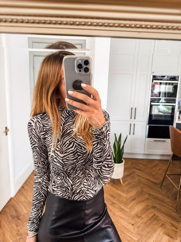 Turn heads in the ICHI Lava Turtleneck, featuring a bold zebra print and sleek, body-skimming fit. With its high neck and long sleeves, it adds just the right edge while keeping you comfortably covered. Wear it solo or layer it up—either way, it’s made to stand out.