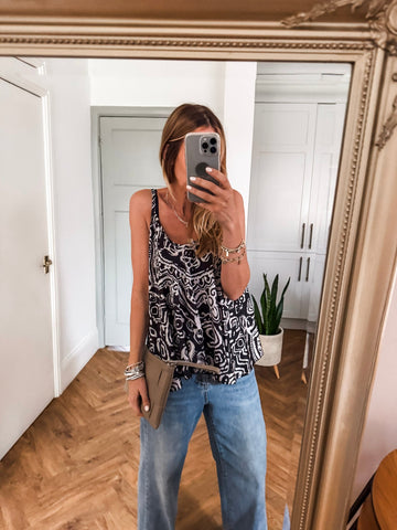 2 gorgeous silk camis, featuring two stylish designs — one in a bold animal print and the other in a modern geometric print. Both camis are crafted from soft, lightweight silk for a luxurious feel and effortless drape. They feature a low round neckline and delicate spaghetti straps, offering a flattering, feminine silhouette. The fit is loose and airy, gently skirting out at the bottom to create a relaxed, flowy shape that moves with you. Perfect for warm days or layering under a jacket for a chic look.