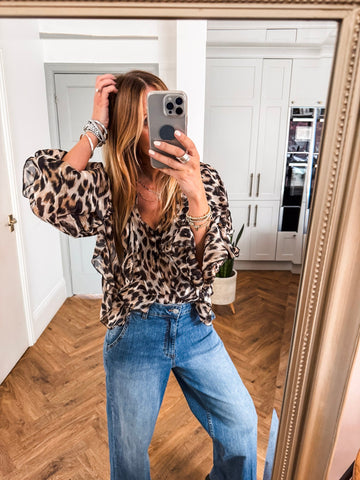Fall in love with this Leopard Print Ruffle Shirt where the blend of sheer fabric and metallic threads creates a mesmerizing interplay of light. Its tasteful v-neck and elegant ruffle details exude confidence and charm, making it a perfect choice for those seeking a blend of boldness and style in their wardrobe.