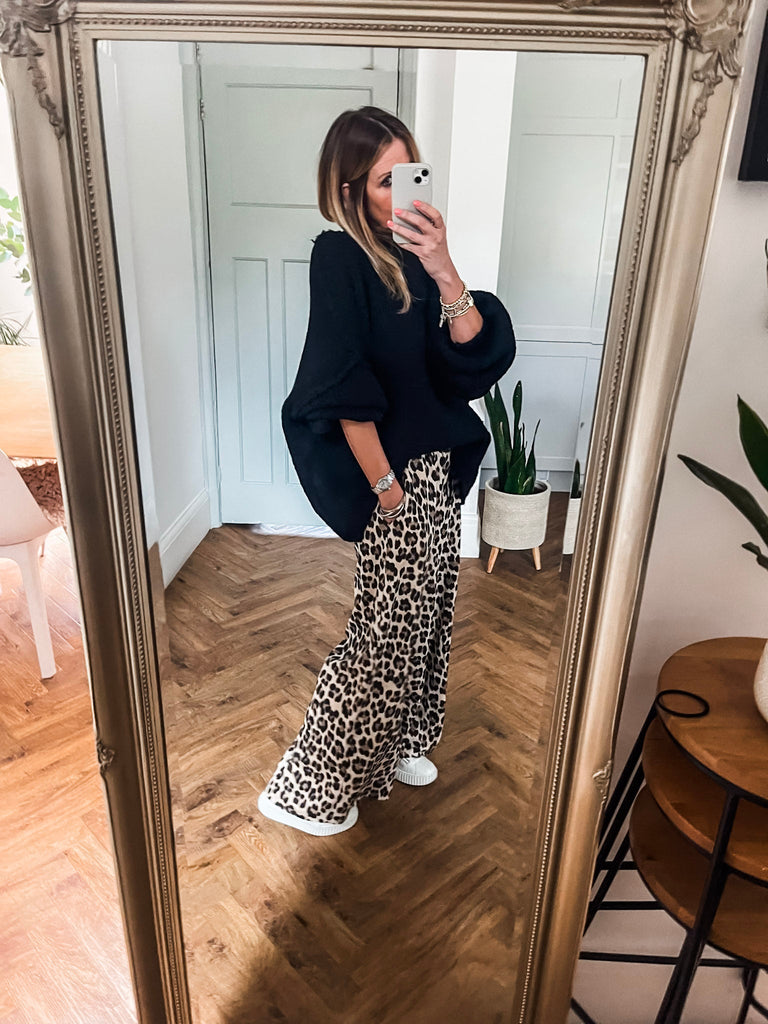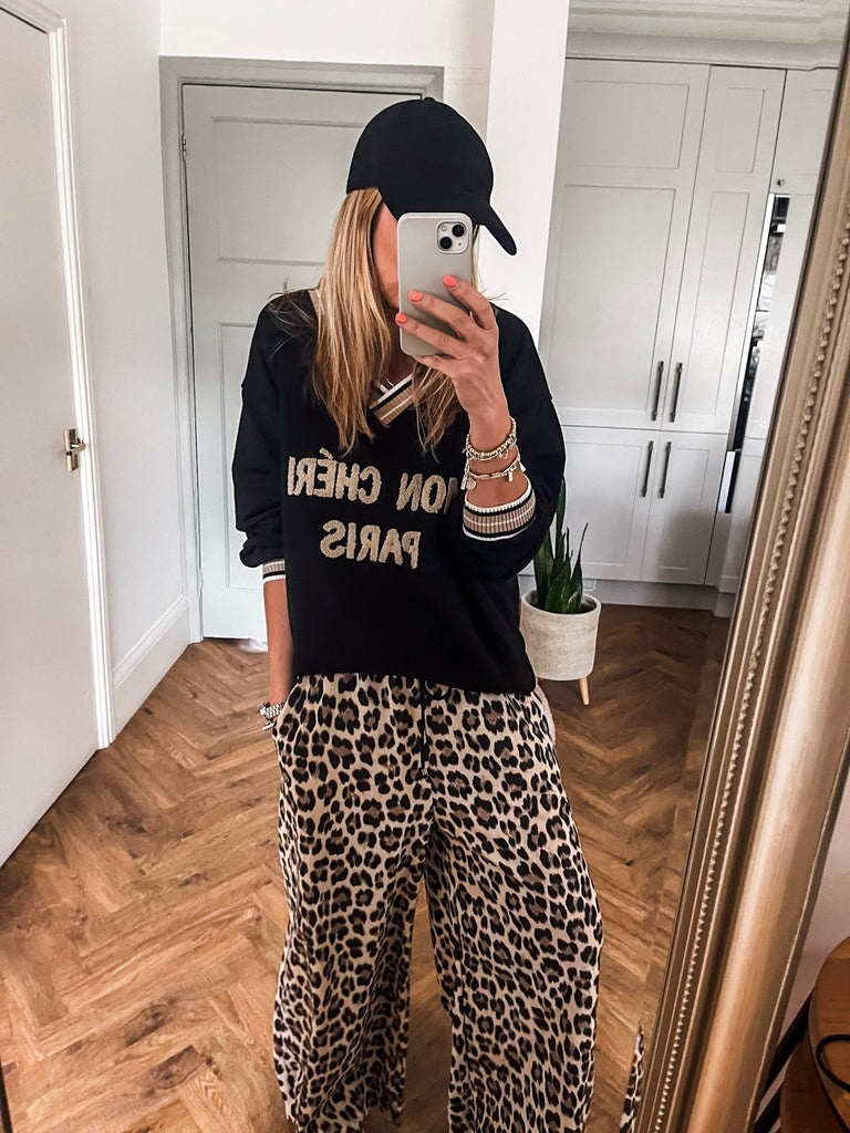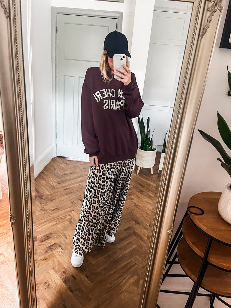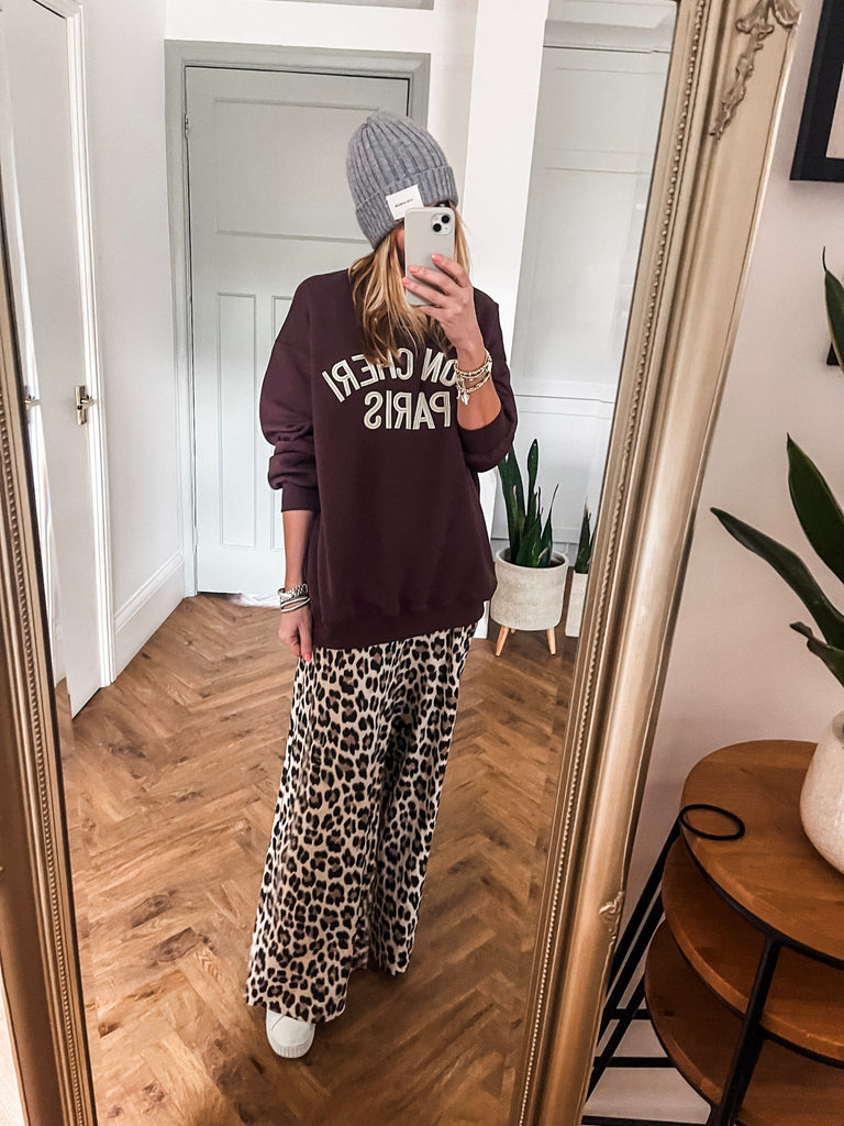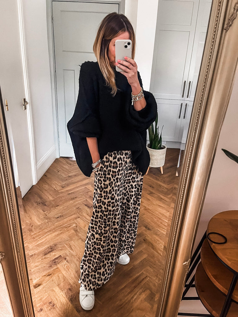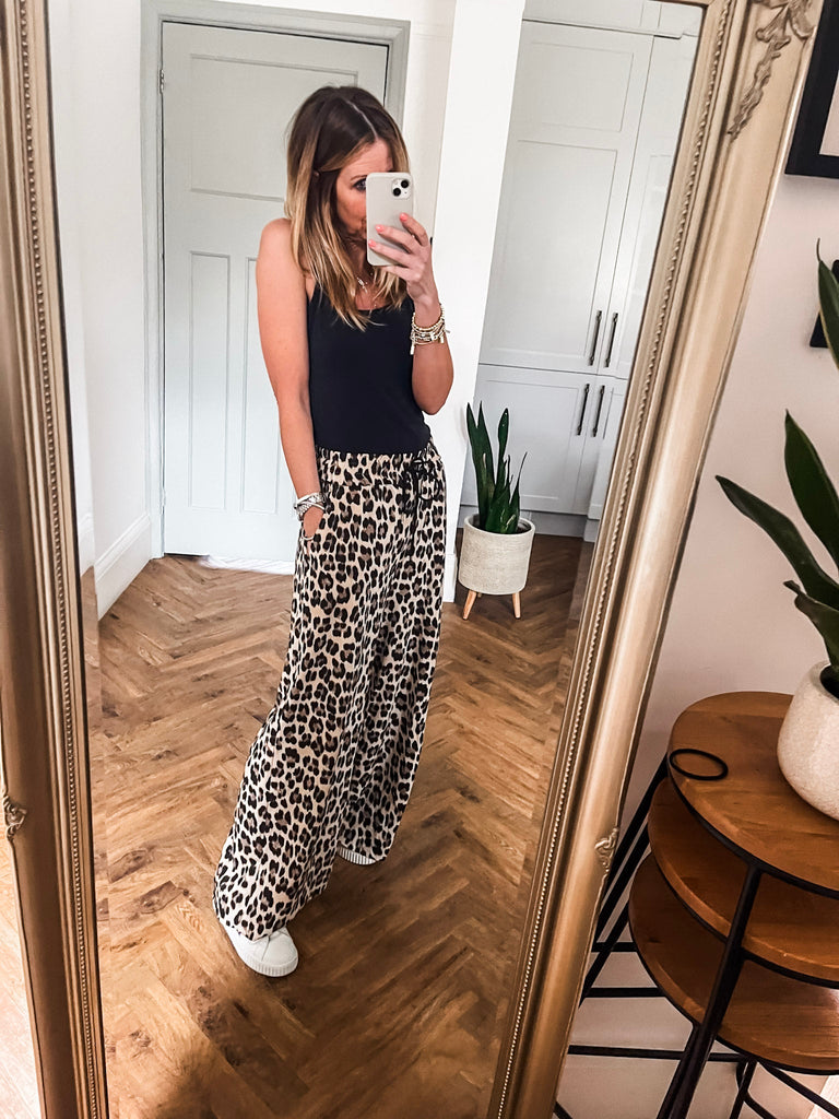 Pair these leopard wide-leg trousers with a sleek black top and heels for a bold, evening-ready look. Keep it casual with a tucked-in tee and trainers, or add a leather jacket for an effortlessly cool edge. Versatile and stylish, they’re the perfect statement piece for any wardrobe.
