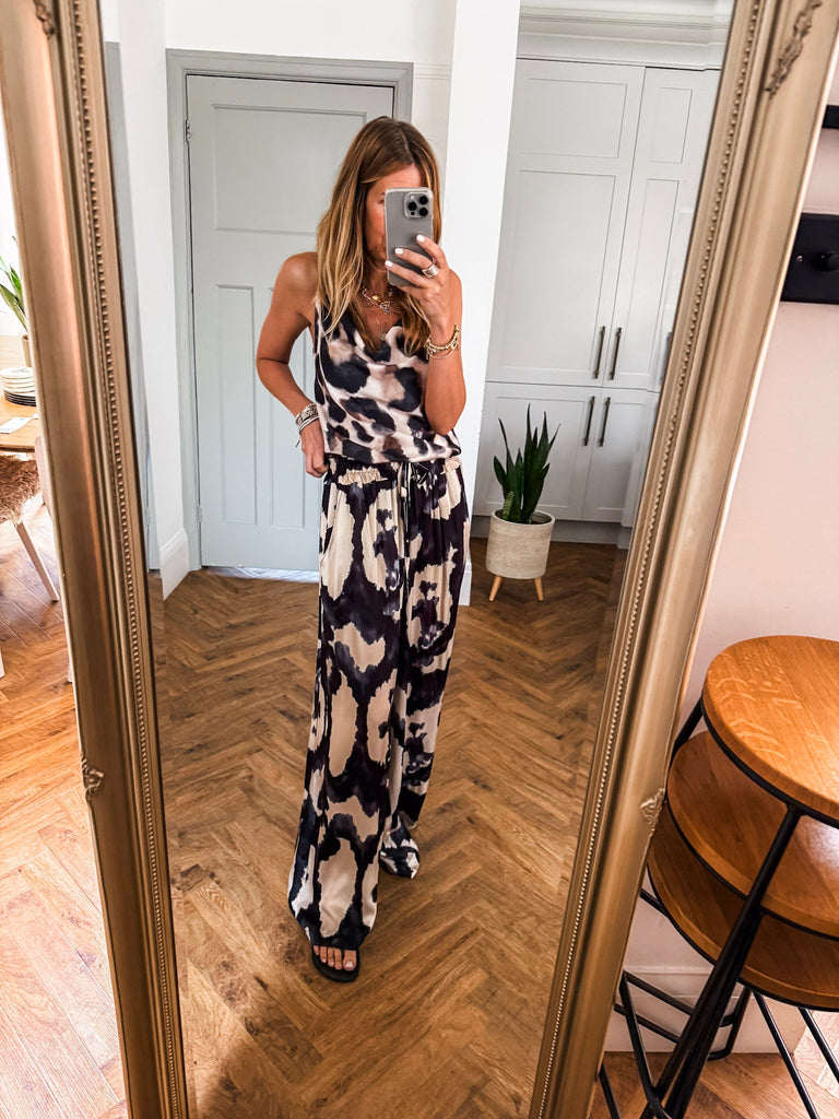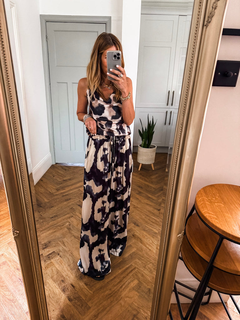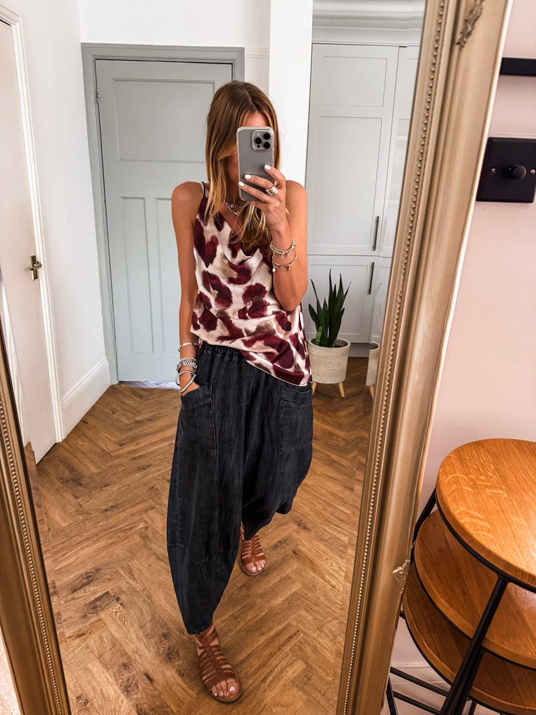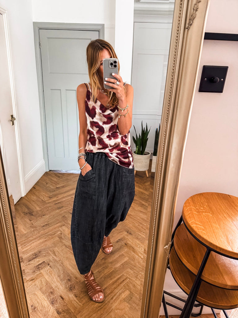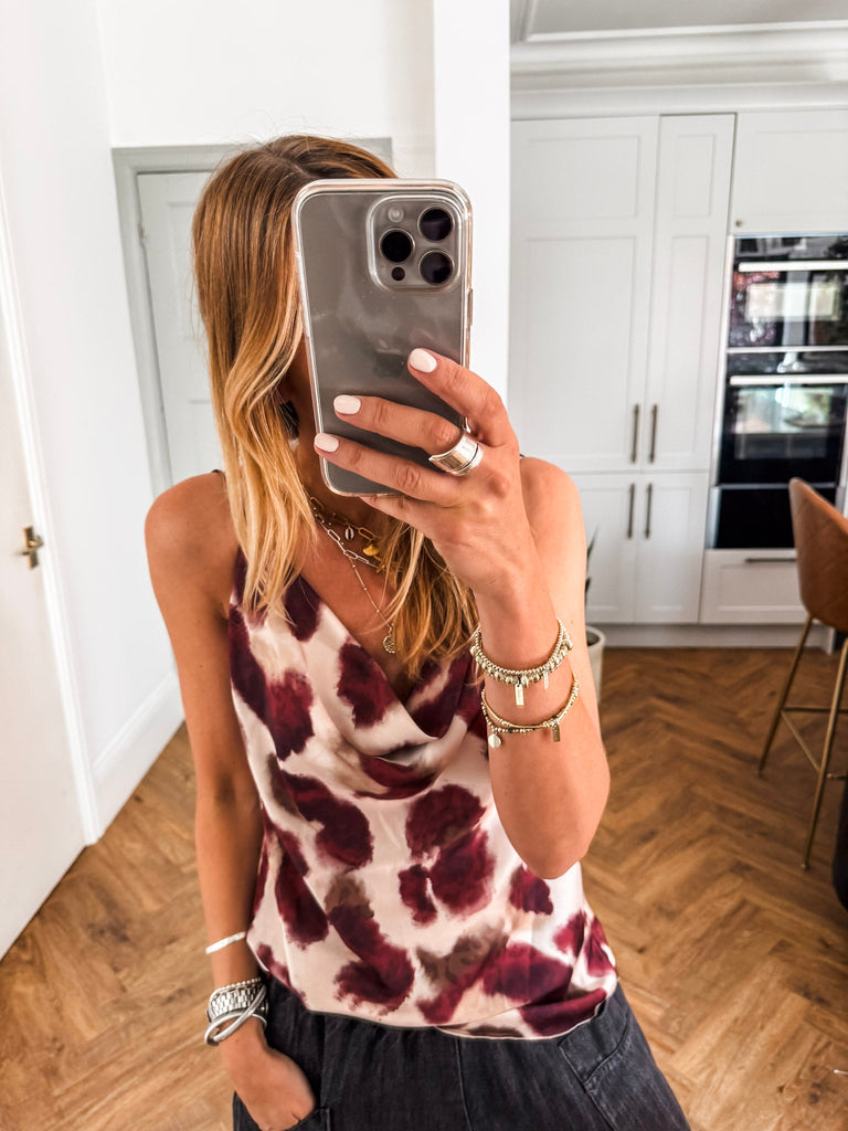 We love this vest for its striking print, luxurious satin feel, and effortlessly chic silhouette. The cowl neckline and delicate straps offer just the right mix of bold and refined. It’s the perfect piece to add instant impact to any outfit, day or night.