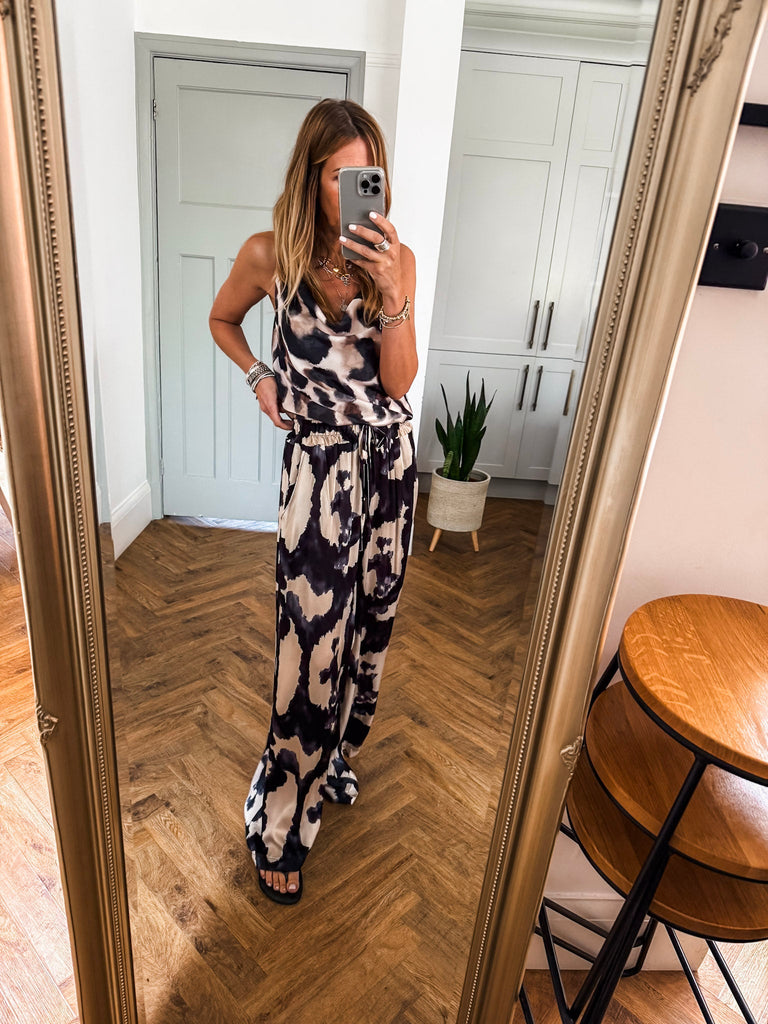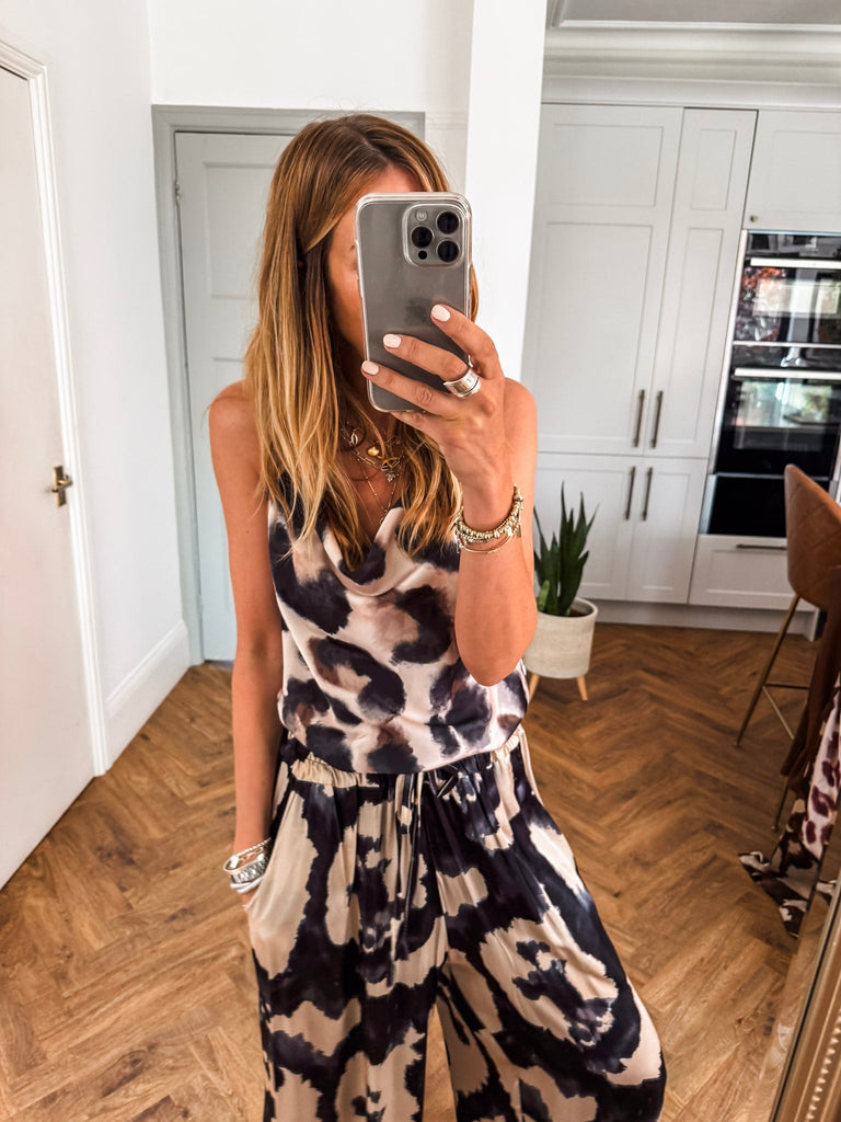 Turn heads in this abstract animal print cowl vest, crafted from smooth satin for a sleek, elevated look. The bold print and draped neckline add effortless edge, while delicate shoe-string straps bring a touch of elegance. Perfect for layering or wearing solo when you want to stand out with style.