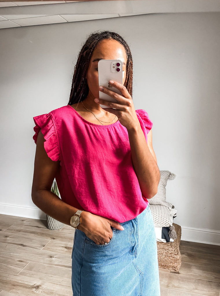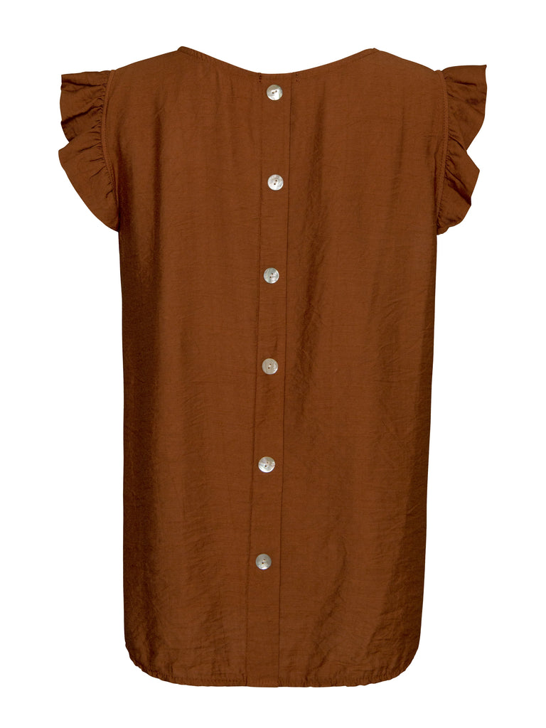Elevate your wardrobe with the Frill Sleeve Button Back top, a versatile piece that effortlessly transitions between casual and formal occasions. With charming frill sleeves and button detailing down the back, this top adds a touch of elegance and femininity to your outfit. It's a must-have addition for both your everyday and special occasion outfits!