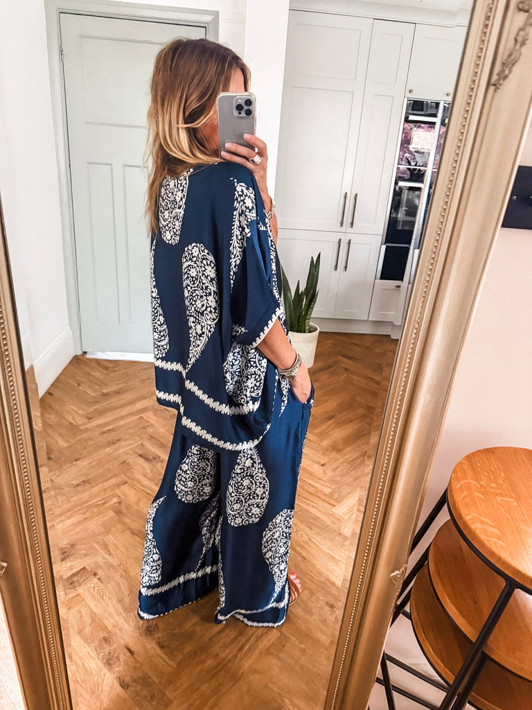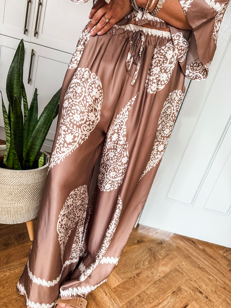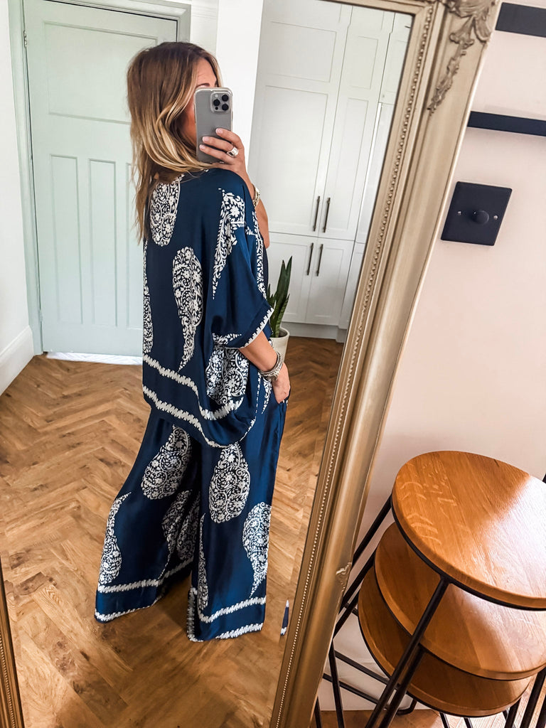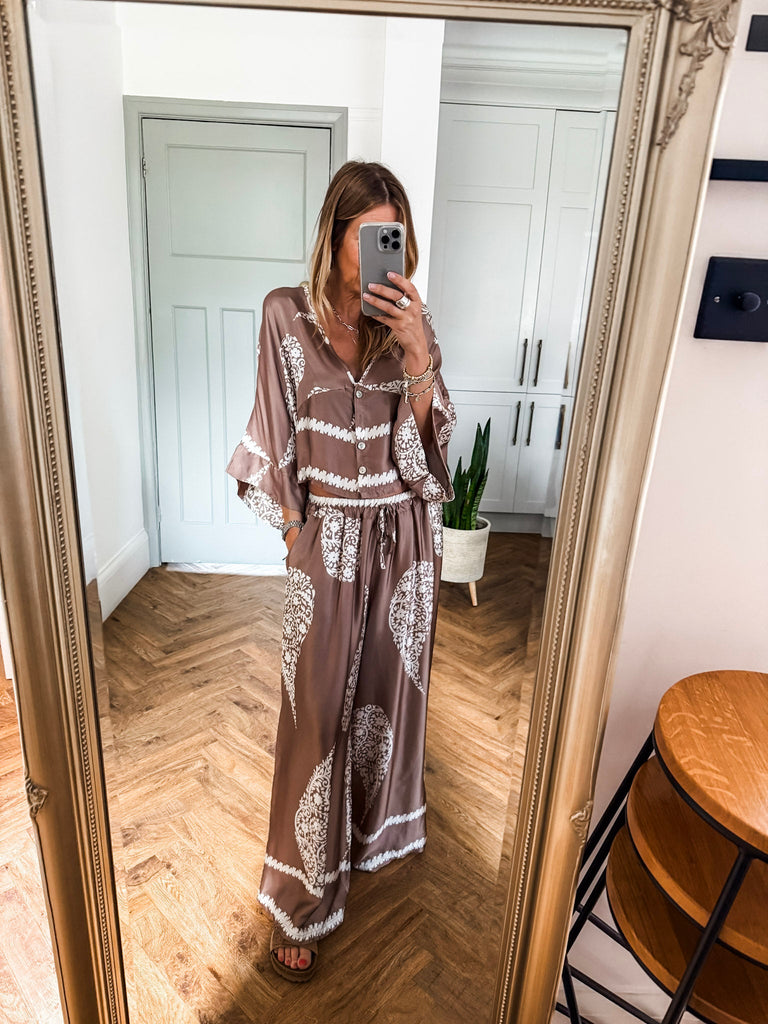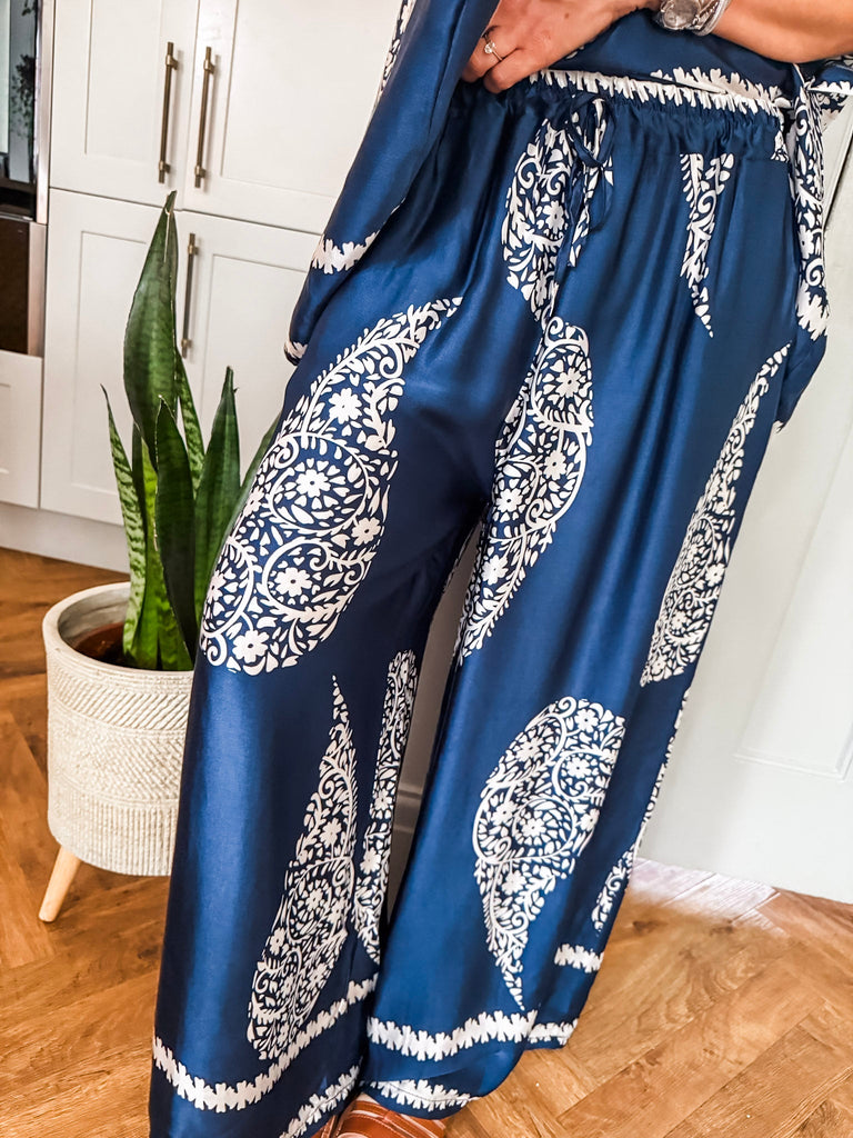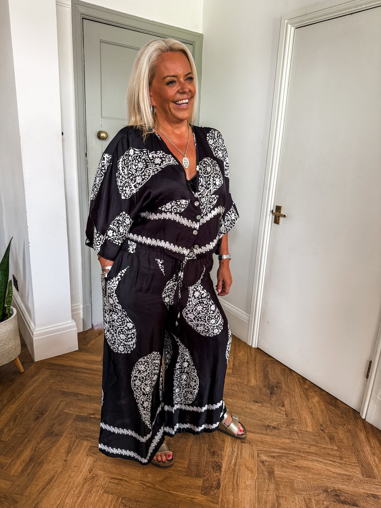 Effortlessly cool, these Paisley Print Satin Wide Leg Trousers blend comfort with standout style. The silky satin, elasticated waist, and wide-leg cut offer a relaxed yet refined fit. With practical pockets, they’re your go-to for laid-back days or elevated evenings.