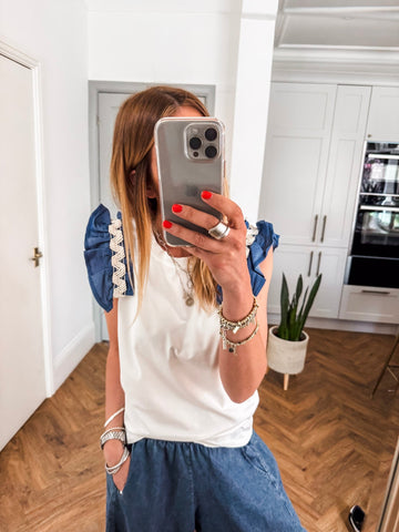Gorgeous new summer top! Make a subtle statement with our Denim Frill Sleeve T-Shirt—where casual meets cool. Featuring soft denim sleeves and a classic round neck, it’s your go-to for effortless everyday style. A fresh twist on a wardrobe staple.