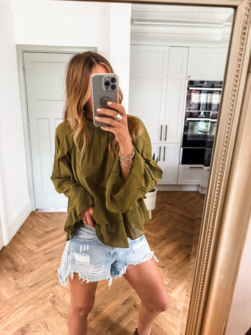 We love this blouse for its romantic, feminine details—the delicate frills, lightweight fabric, and high neckline create an effortlessly elegant look. Its sheer, flowy design adds a touch of softness and versatility, making it perfect for both casual days and dressier occasions.