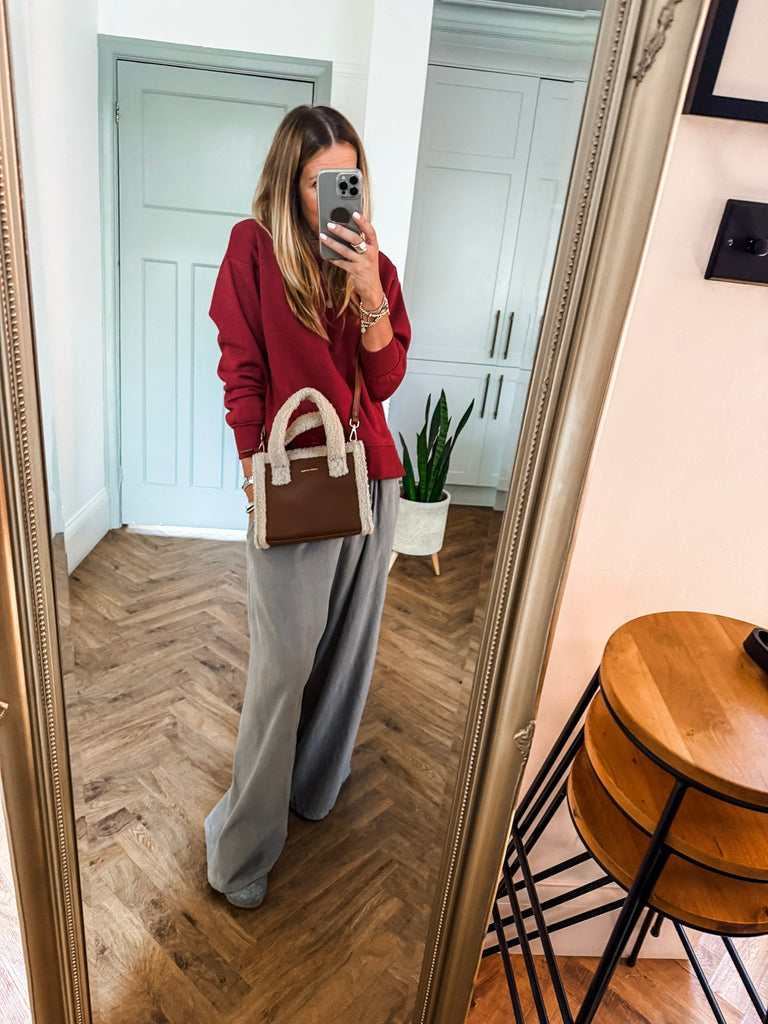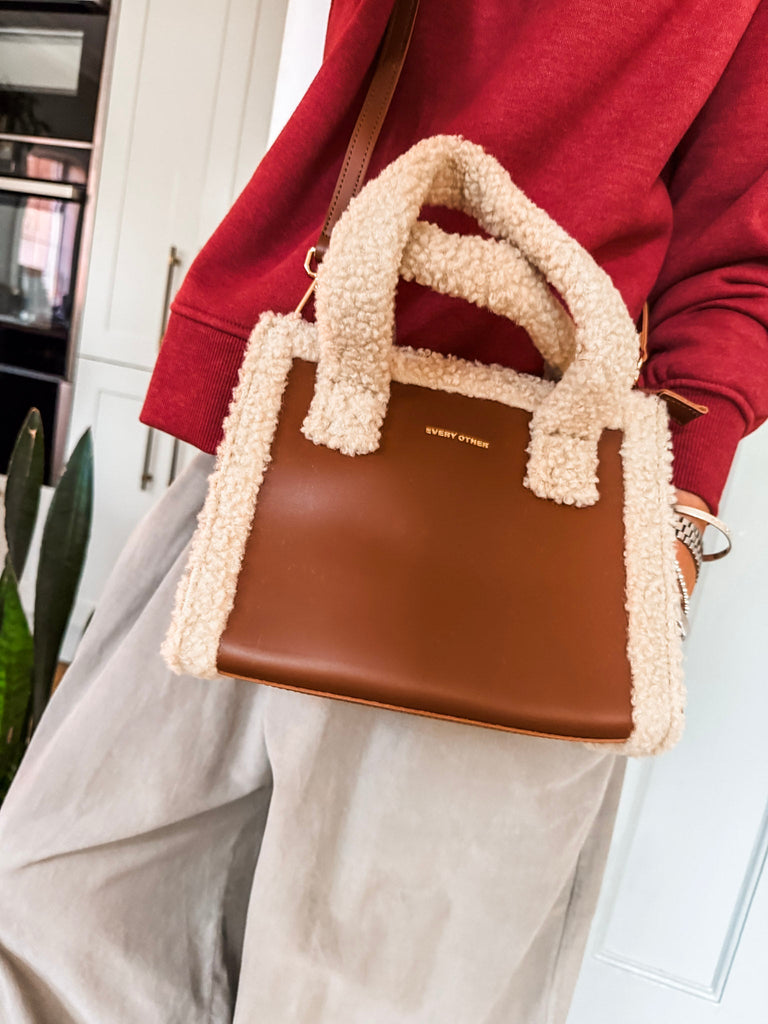 Style it with a tailored coat and ankle boots for an elevated everyday look. Pair it with denim and an oversized knit to add texture and edge. For evenings out, carry it by the handle to let the shearling detail shine.