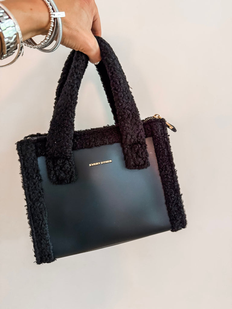 The Every Other Square Shearling Grab Bag adds a cool edge with its contrast of soft shearling trim and sleek PU leather. Designed for both style and function, it features a secure zip closure and an optional strap for versatile wear. The perfect statement piece to elevate any look.