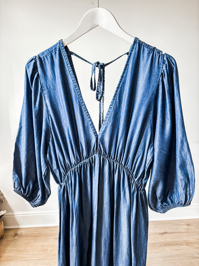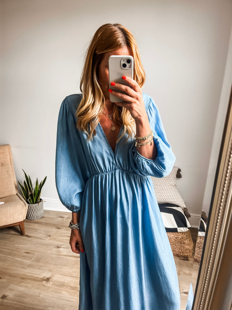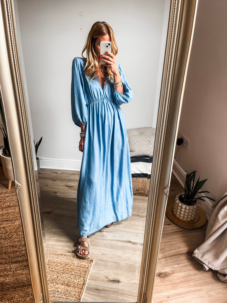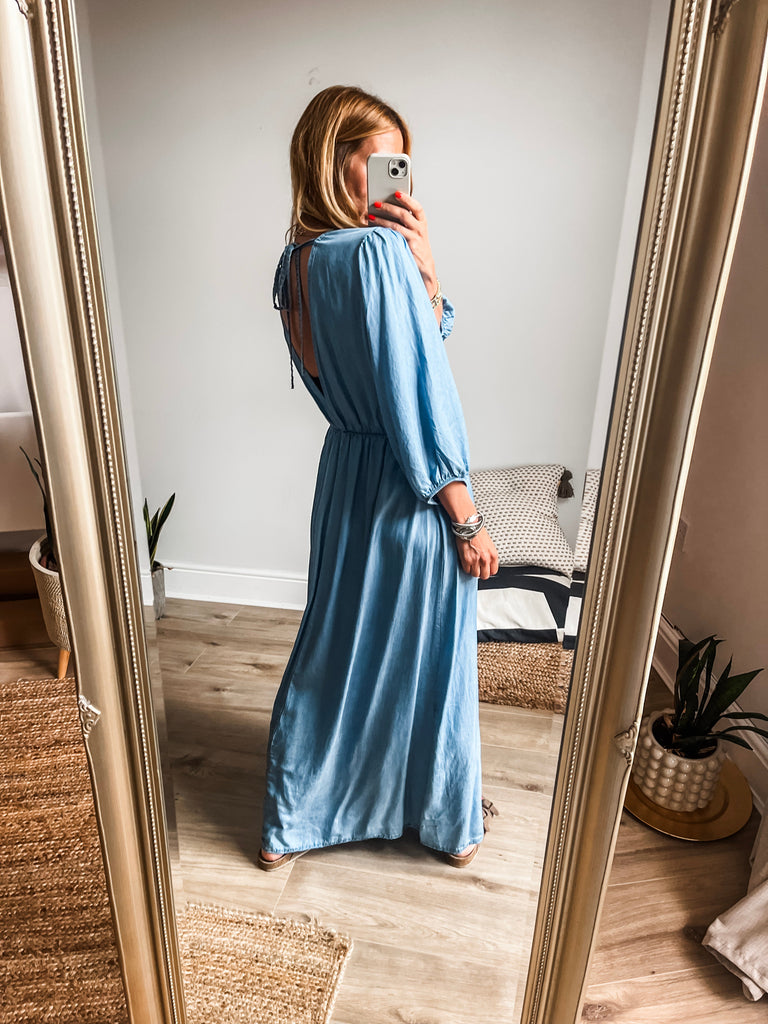Elevate your summer style with our Long Sleeve Chambray Maxi Dress, featuring chic balloon sleeves, a flattering elastic waistband, and a trendy tie back. Perfect for holidays or nights out, this lightweight and cool maxi dress ensures you stay comfortable and effortlessly stylish. Your must-have for a fashion-forward season!