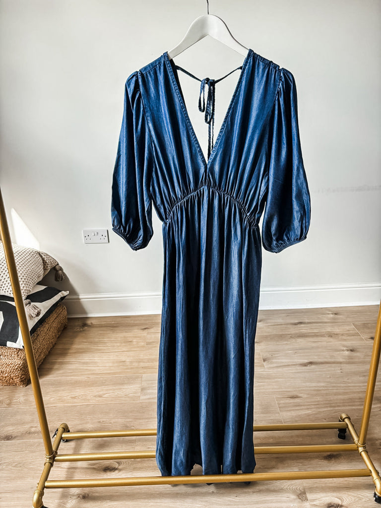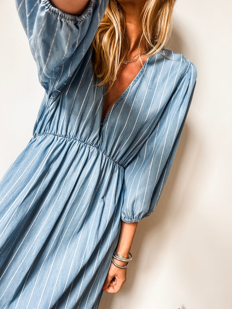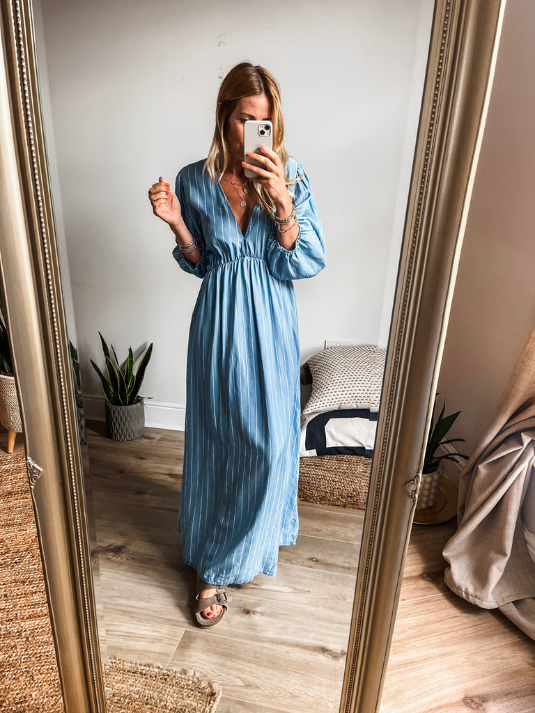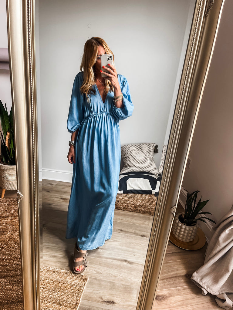 Elevate your summer style with our Long Sleeve Chambray Maxi Dress, featuring chic balloon sleeves, a flattering elastic waistband, and a trendy tie back. Perfect for holidays or nights out, this lightweight and cool maxi dress ensures you stay comfortable and effortlessly stylish. Your must-have for a fashion-forward season!