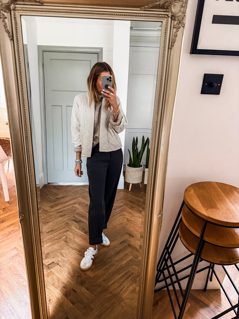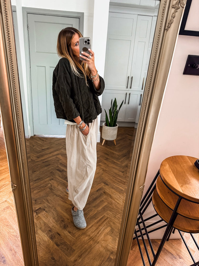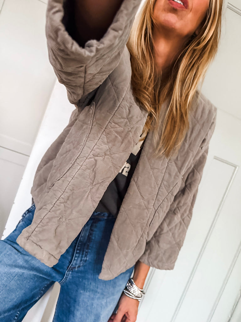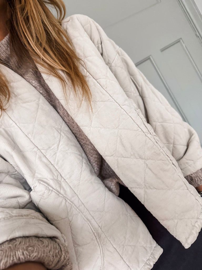This cropped quilted bomber reimagines a classic with a sleek, collarless design and clean lines. Practical pockets meet effortless style, making it ideal for layering. A modern essential for cool, off-duty dressing.
