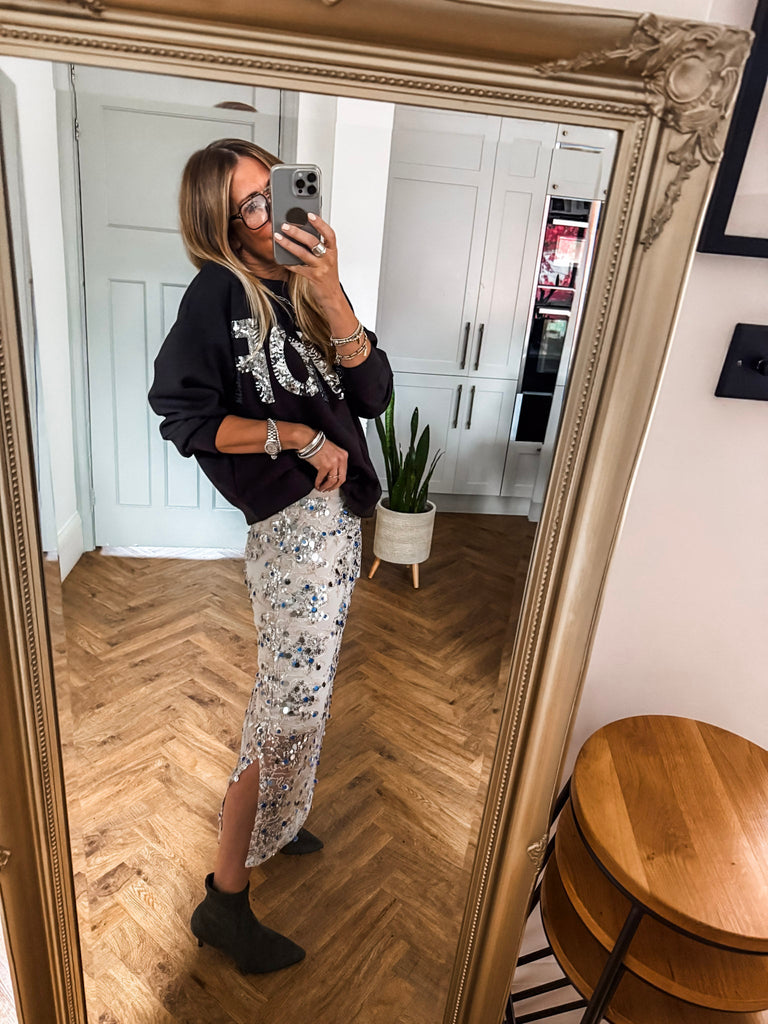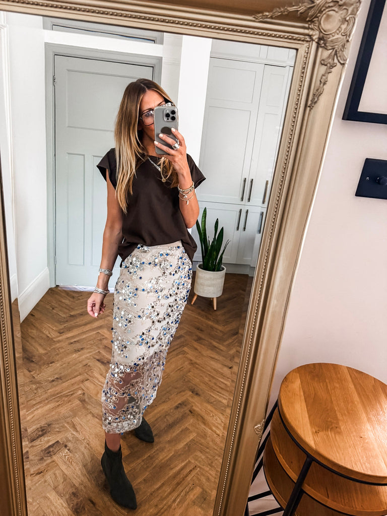 Wow this is beautiful!! Very GLAM!! Shine effortlessly in the Saint Tropez Nelda Skirt, designed with shimmering sequins that move beautifully with every step. The elasticated waist and side splits offer comfort and ease, while the net overlay adds a touch of texture and elegance. Perfect for styling any look from day to night. Matching Top Available