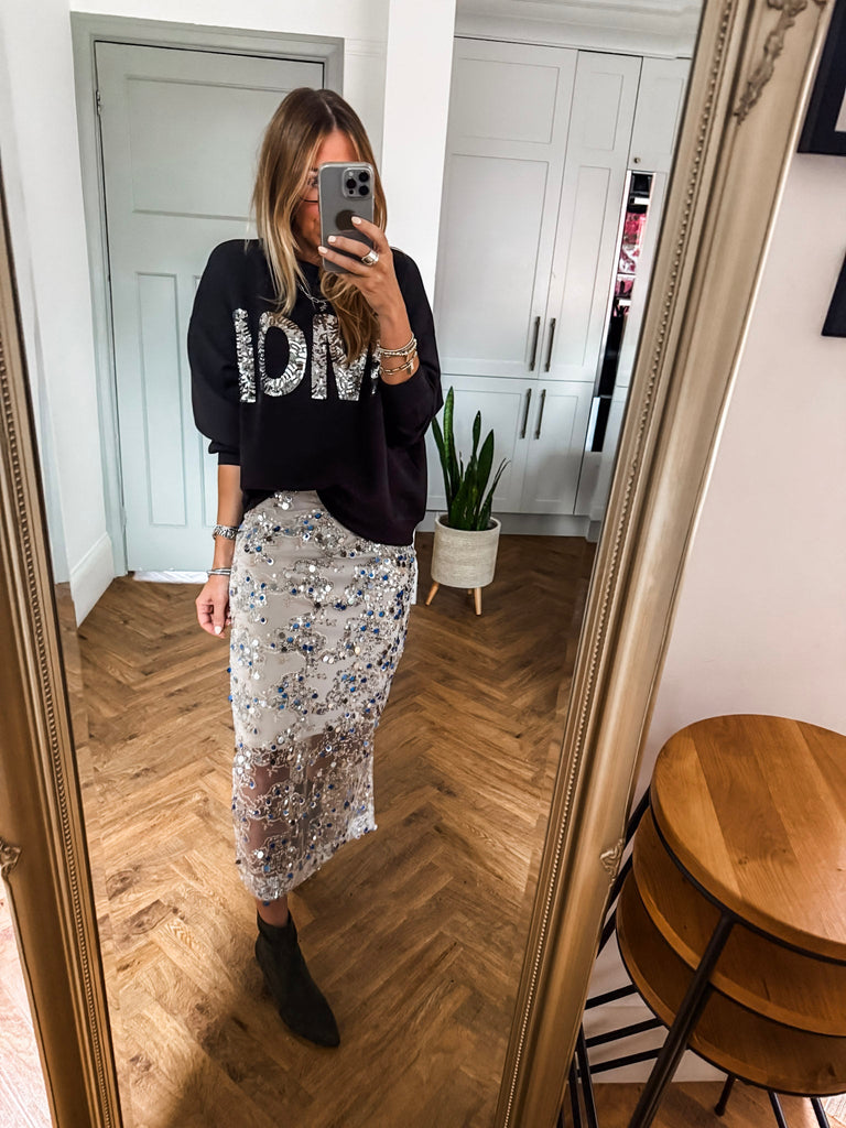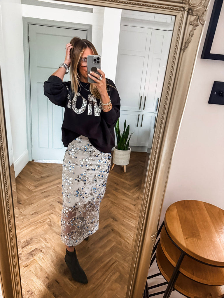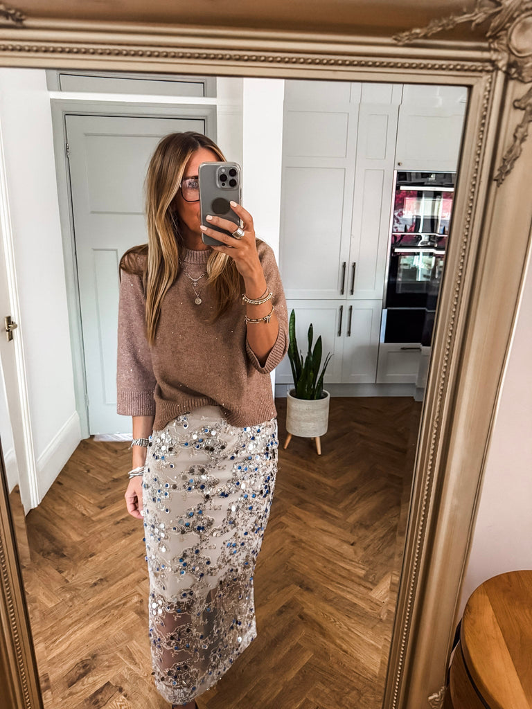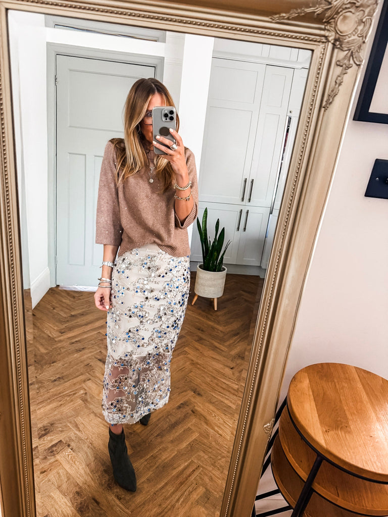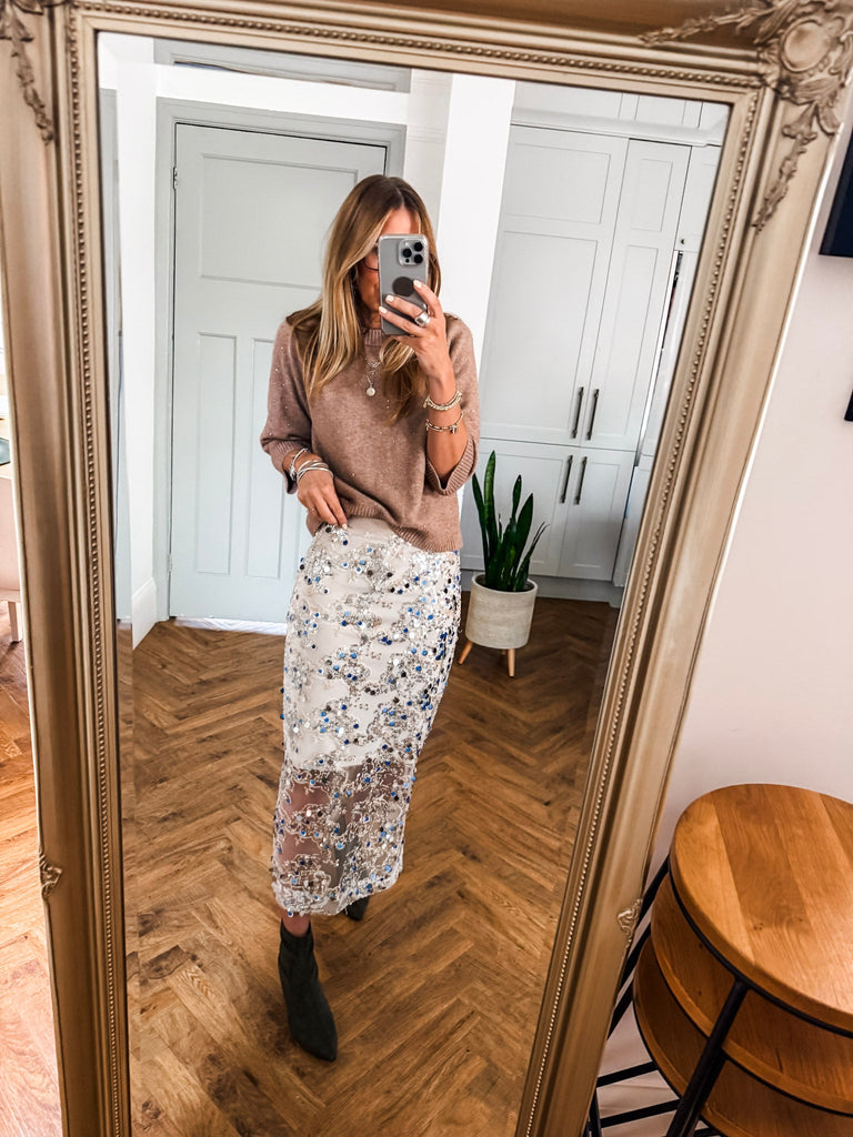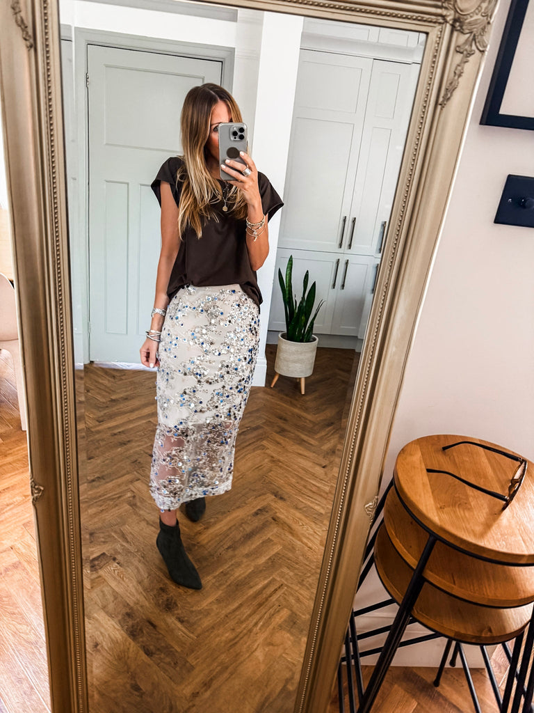 We love this skirt for its effortless blend of glamour and comfort. The shimmering sequins and airy overlay create a look that’s both refined and eye-catching. It’s a versatile piece that makes every occasion feel a little more special.