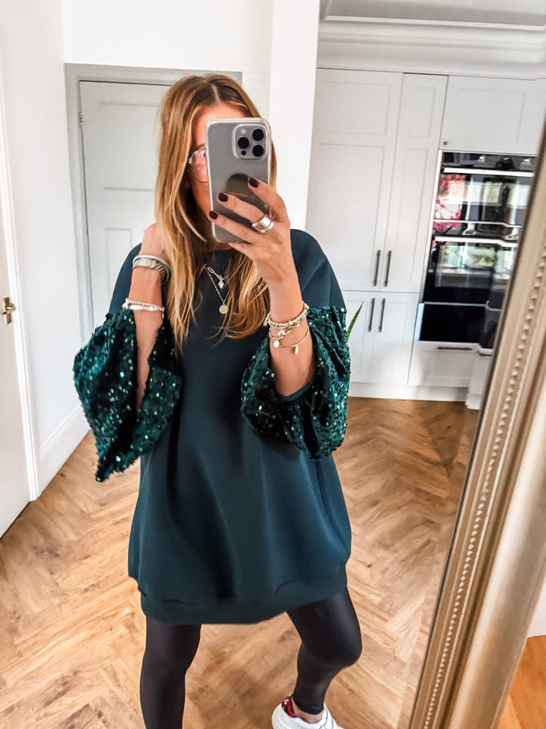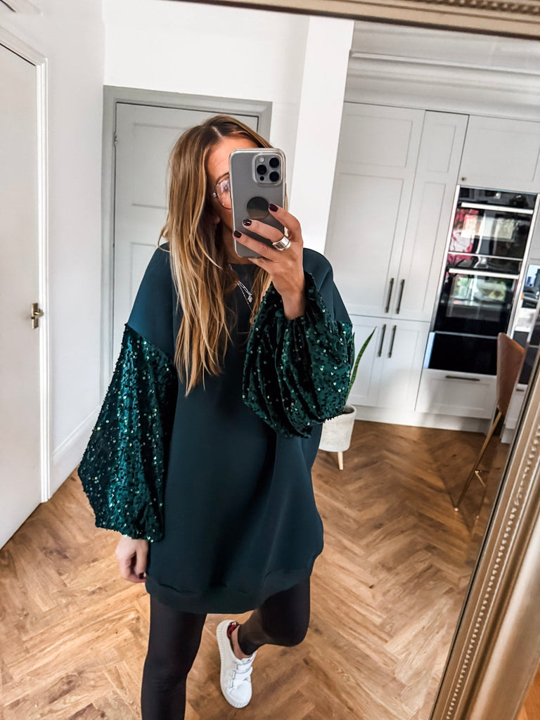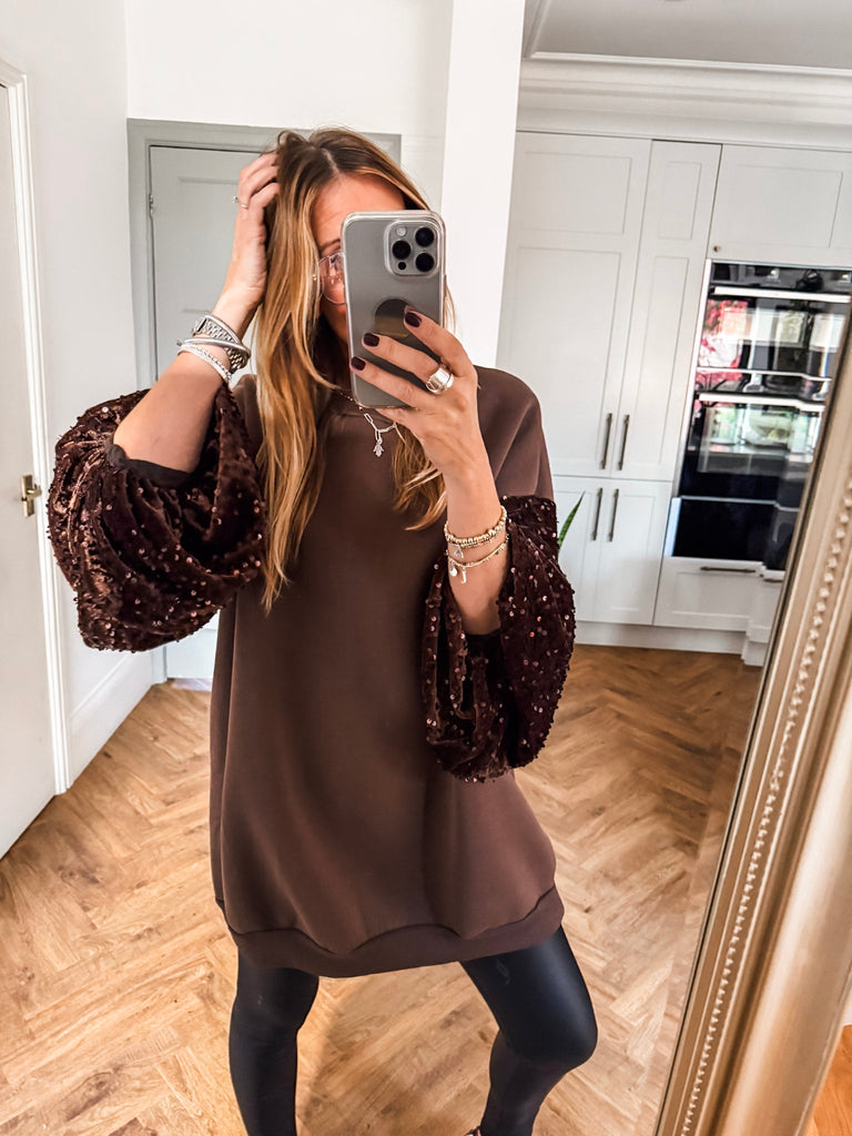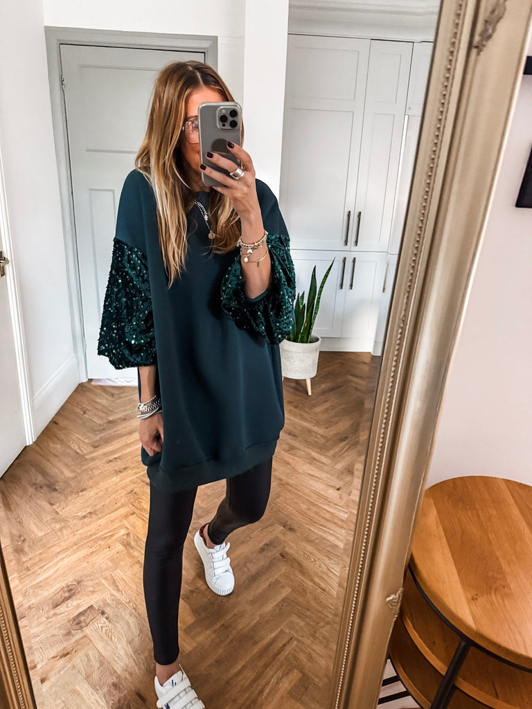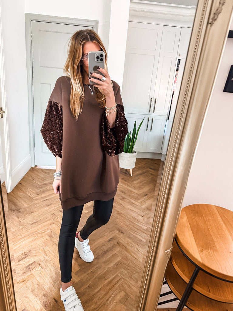 Style it with sleek leggings or leather pants for a chic off-duty look. Add chunky sneakers for day or swap in heeled boots to take it night-out ready. Finish with bold accessories to let the sequin sleeves shine.