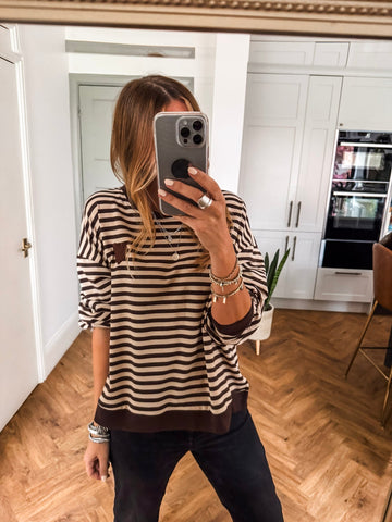 Keep it cool and casual with the Striped Heart Sweatshirt — a laid-back staple with subtle charm. The soft fabric, relaxed fit, and side splits offer all-day comfort and easy movement. Finished with a delicate heart logo, it’s perfect for effortless layering on cooler days.