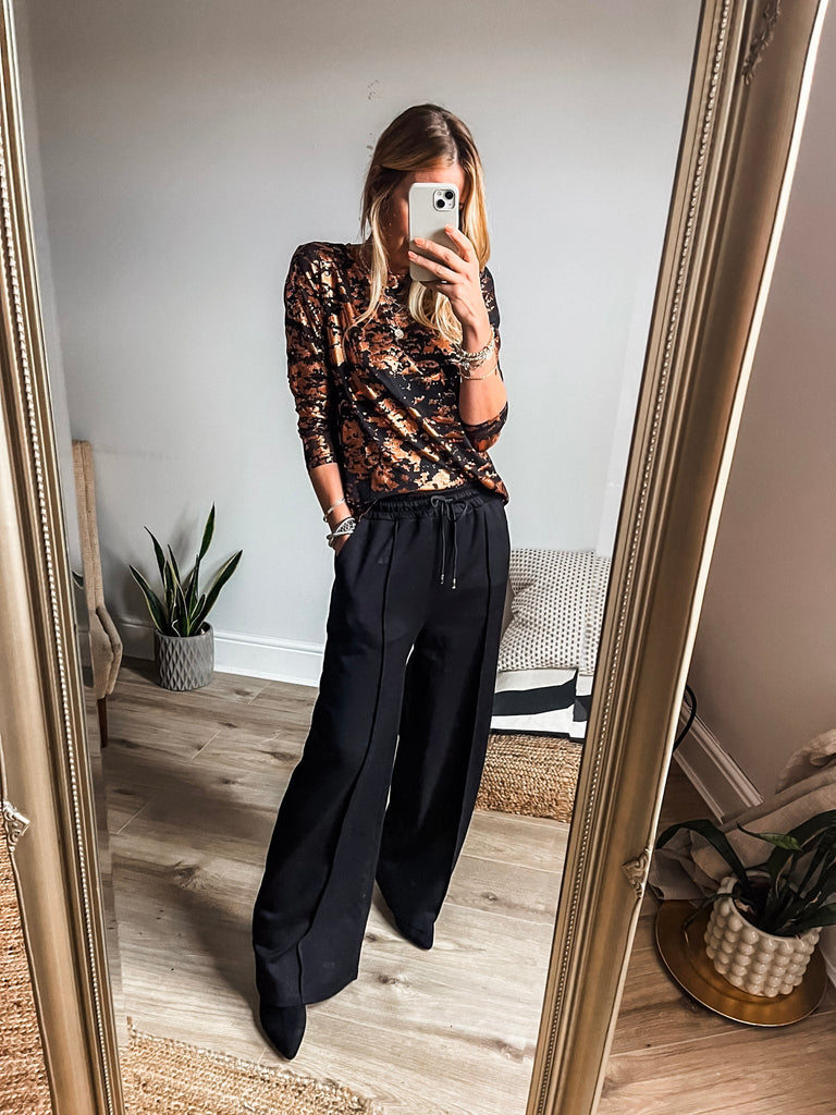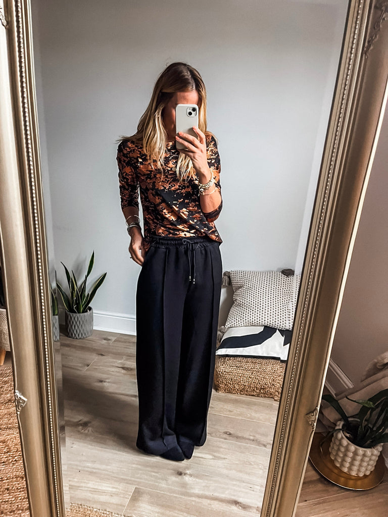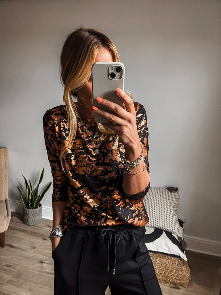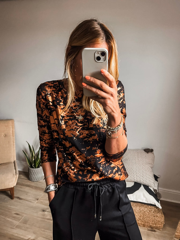 Our Bronze Printed Shiny Mesh Top is going to be a favourite this season. Featuring an eye-catching shiny finish and sleek slim fit. The long sleeves and classic round neck make it a versatile piece for any occasion. Chic and functional, this top adds the perfect touch of cool to your wardrobe. Perfectly paired with our Wide Leg Trousers, it would also look fabulous with one of our midi skirts and jeans.