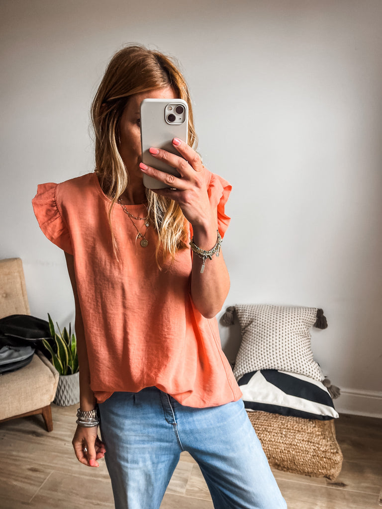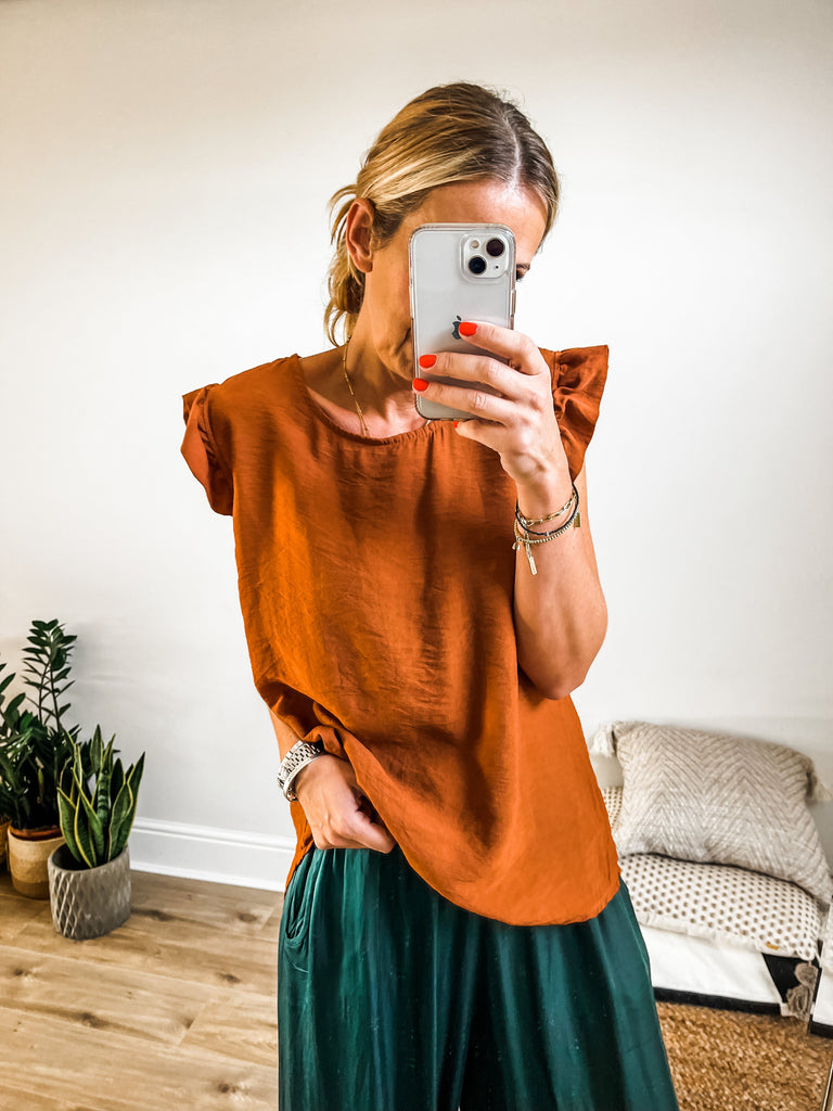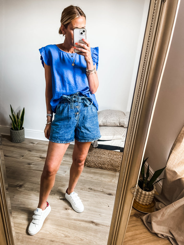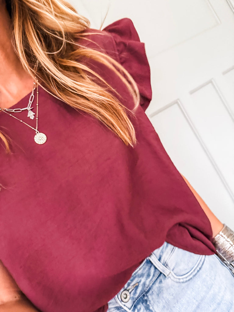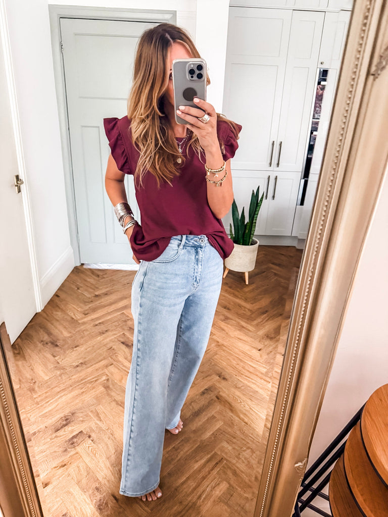 Elevate your wardrobe with the Frill Sleeve Button Back top, a versatile piece that effortlessly transitions between casual and formal occasions. With charming frill sleeves and button detailing down the back, this top adds a touch of elegance and femininity to your outfit. It's a must-have addition for both your everyday and special occasion outfits!