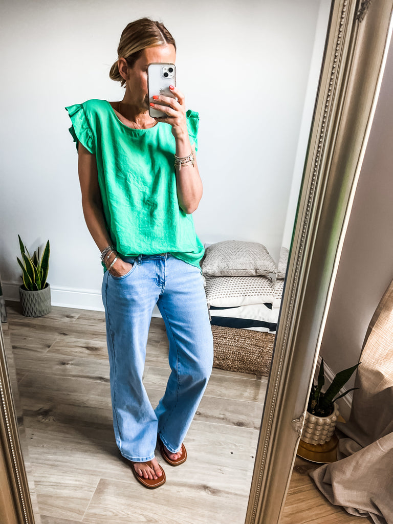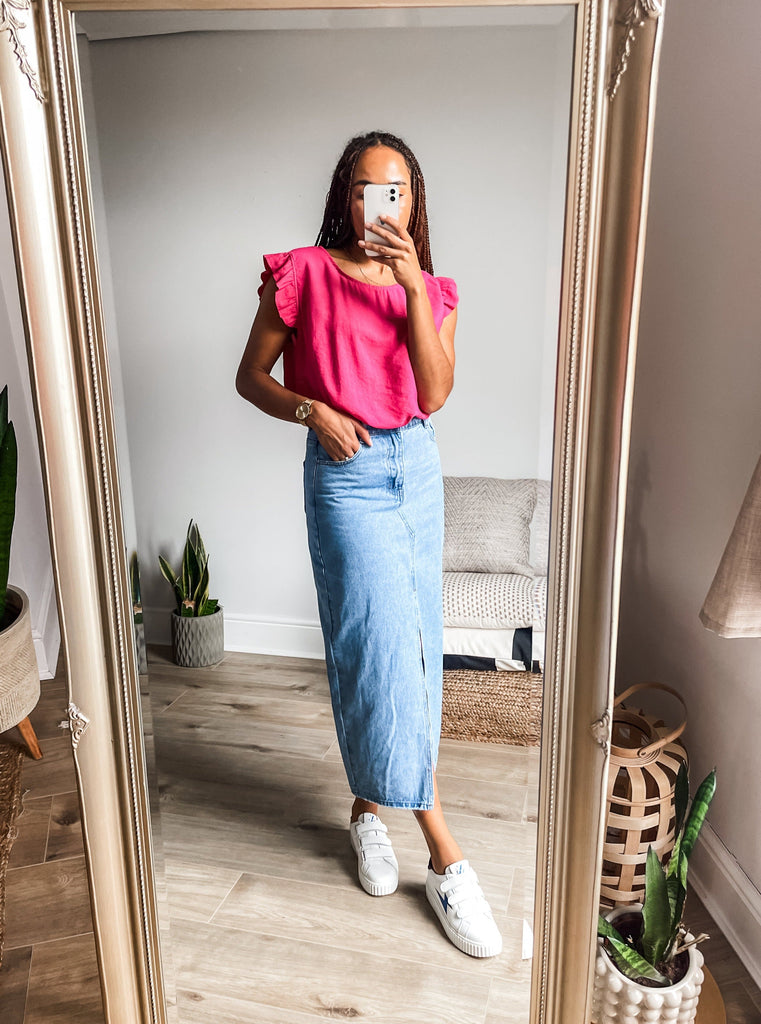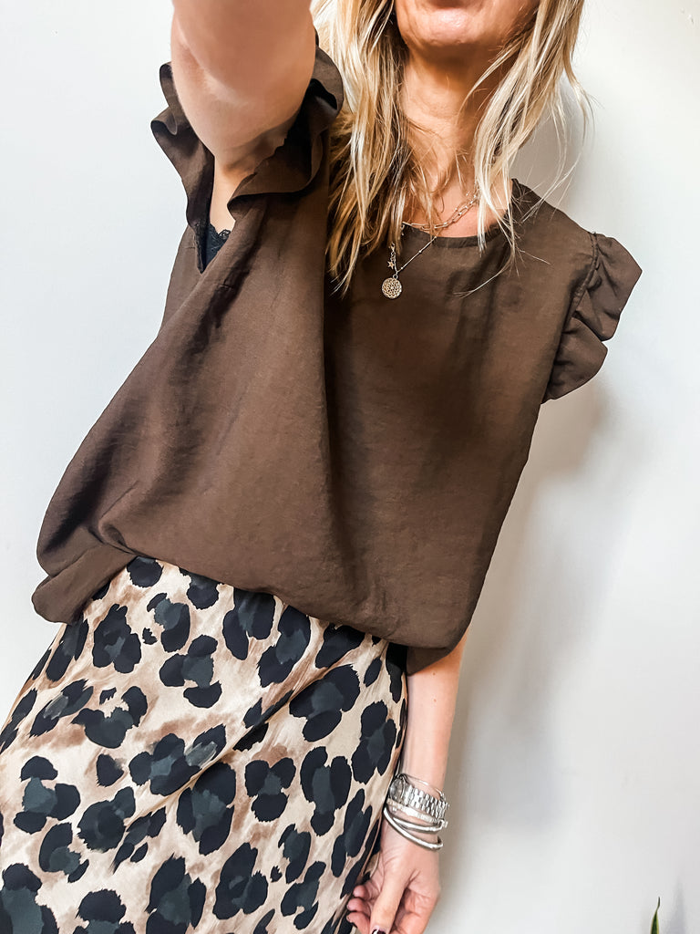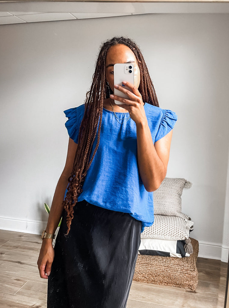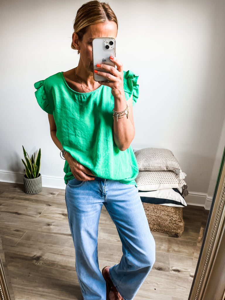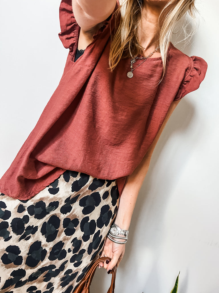 Elevate your wardrobe with the Frill Sleeve Button Back top, a versatile piece that effortlessly transitions between casual and formal occasions. With charming frill sleeves and button detailing down the back, this top adds a touch of elegance and femininity to your outfit. It's a must-have addition for both your everyday and special occasion outfits!