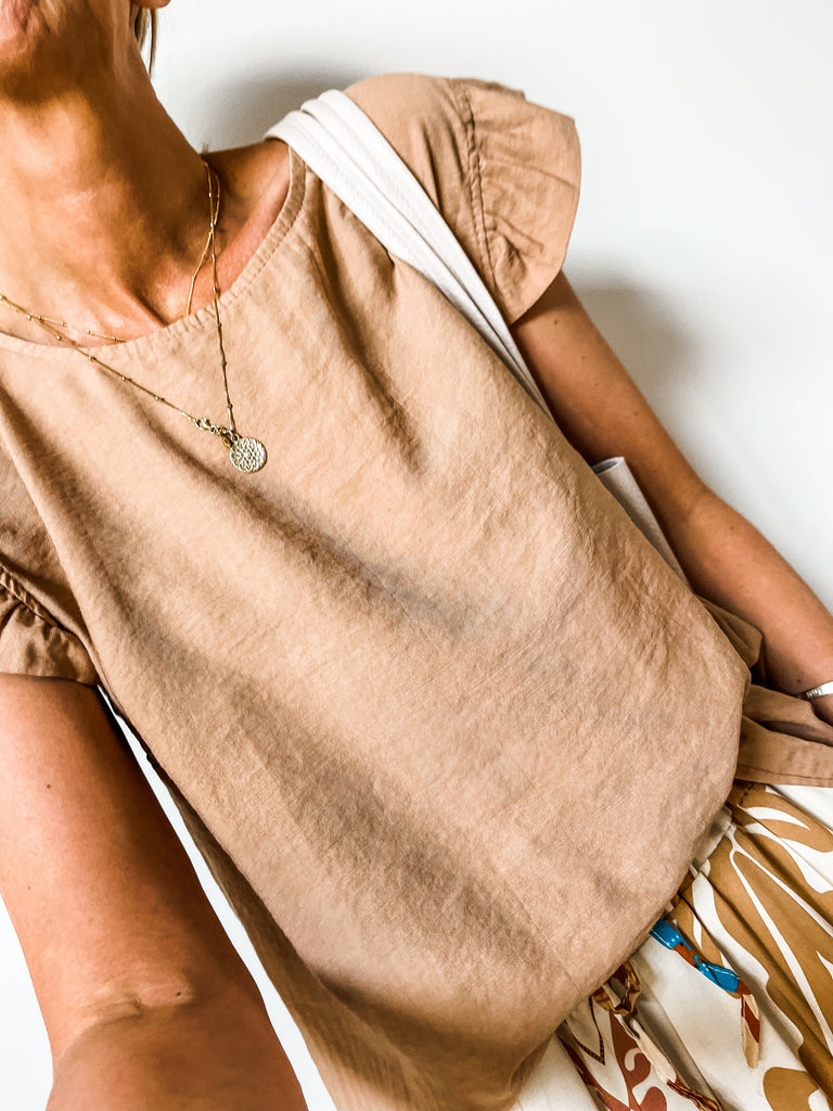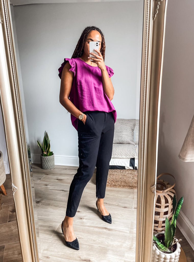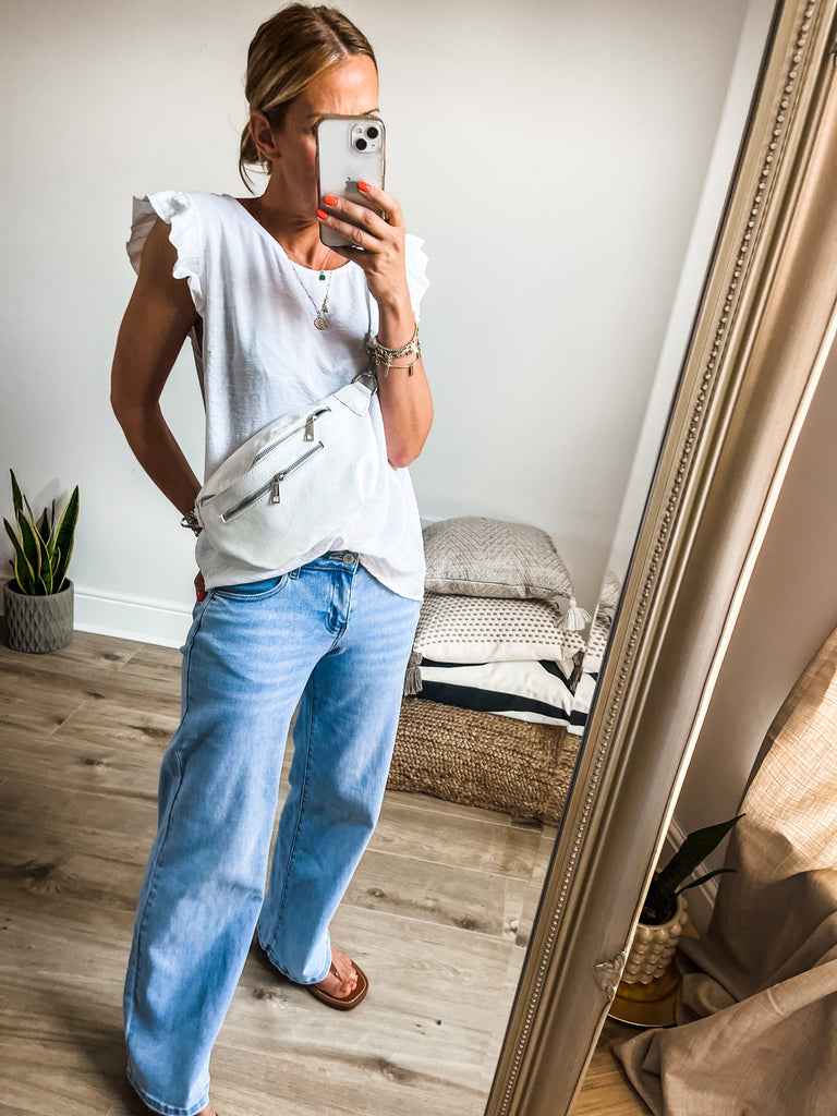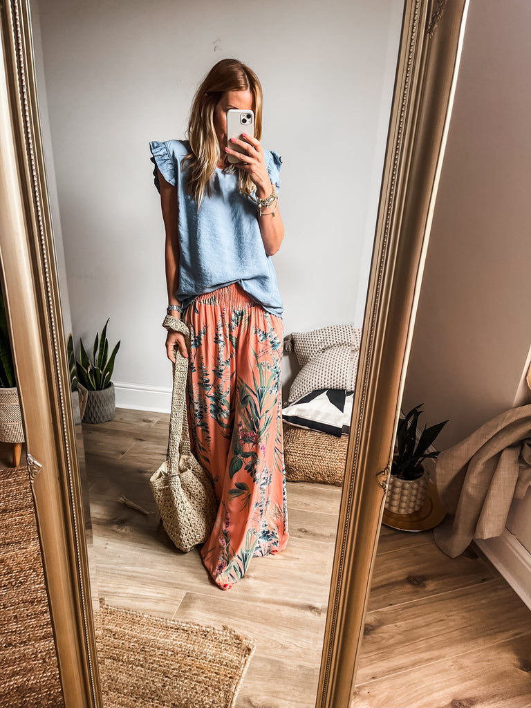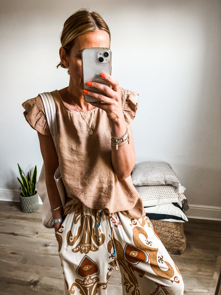 Elevate your wardrobe with the Frill Sleeve Button Back top, a versatile piece that effortlessly transitions between casual and formal occasions. With charming frill sleeves and button detailing down the back, this top adds a touch of elegance and femininity to your outfit. It's a must-have addition for both your everyday and special occasion outfits!