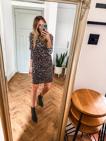 Style this animal print mini dress with knee-high boots and a leather jacket for an edgy daytime look. Swap in heels and bold earrings to take it into the evening. Add a crossbody bag to keep it effortlessly chic.