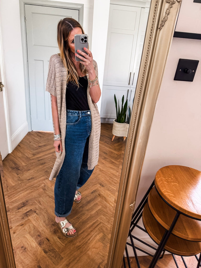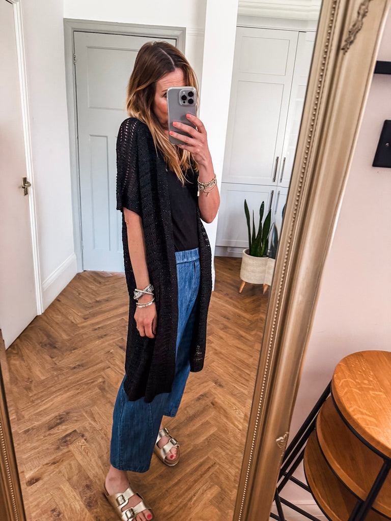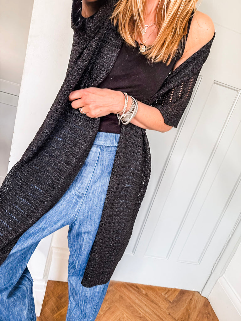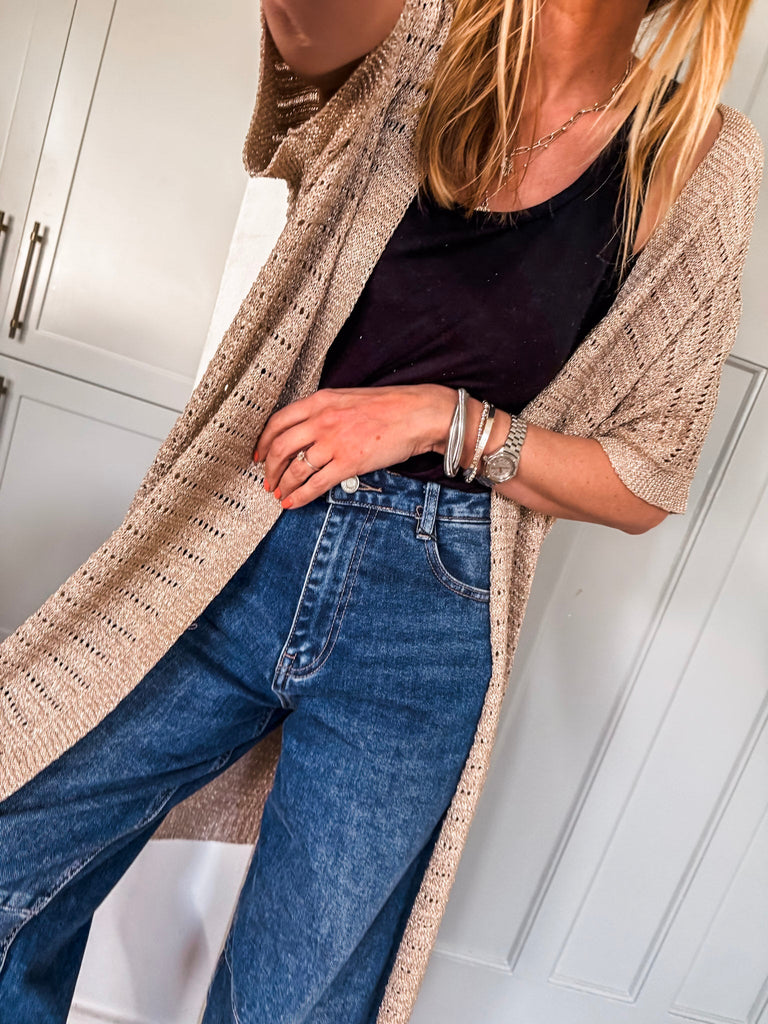 This is gorgeous over your bikini or vest & jeans! Add a touch of effortless glam with our Shimmer Long Cardigan. Designed with an open front and cropped sleeves, it layers beautifully over any look. The sleek length and subtle shimmer bring modern elegance to your everyday style.
