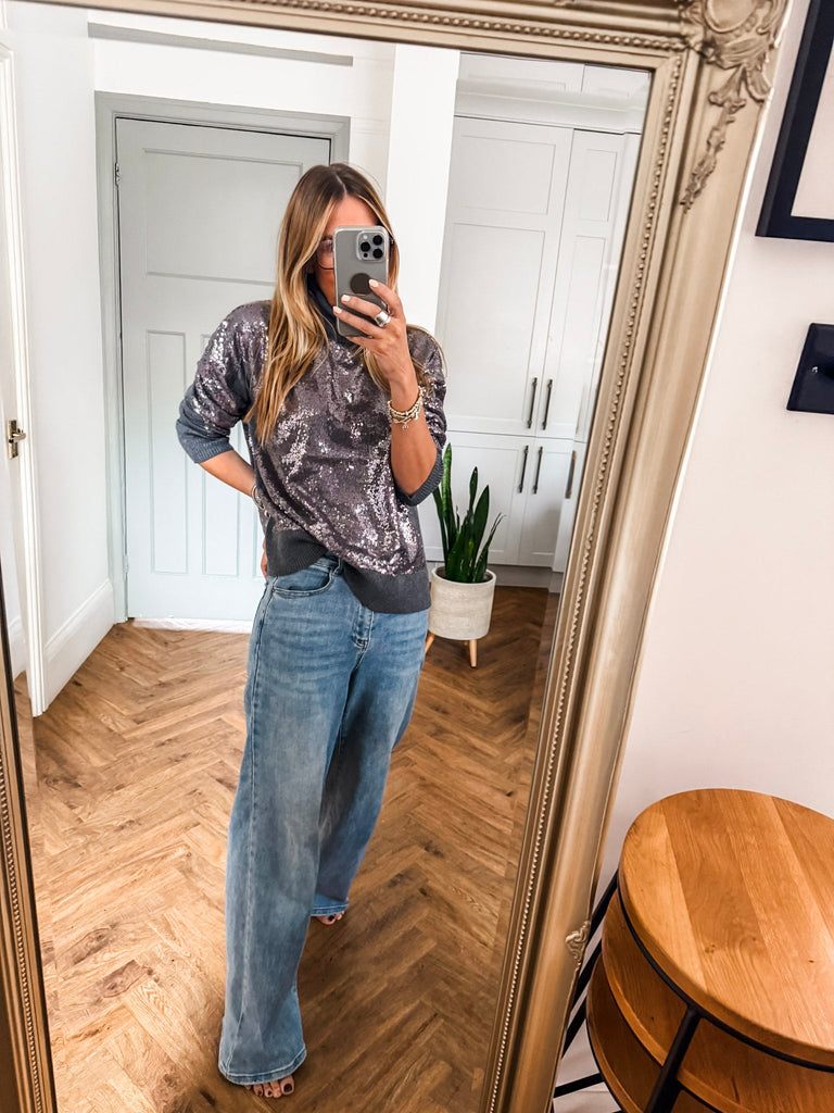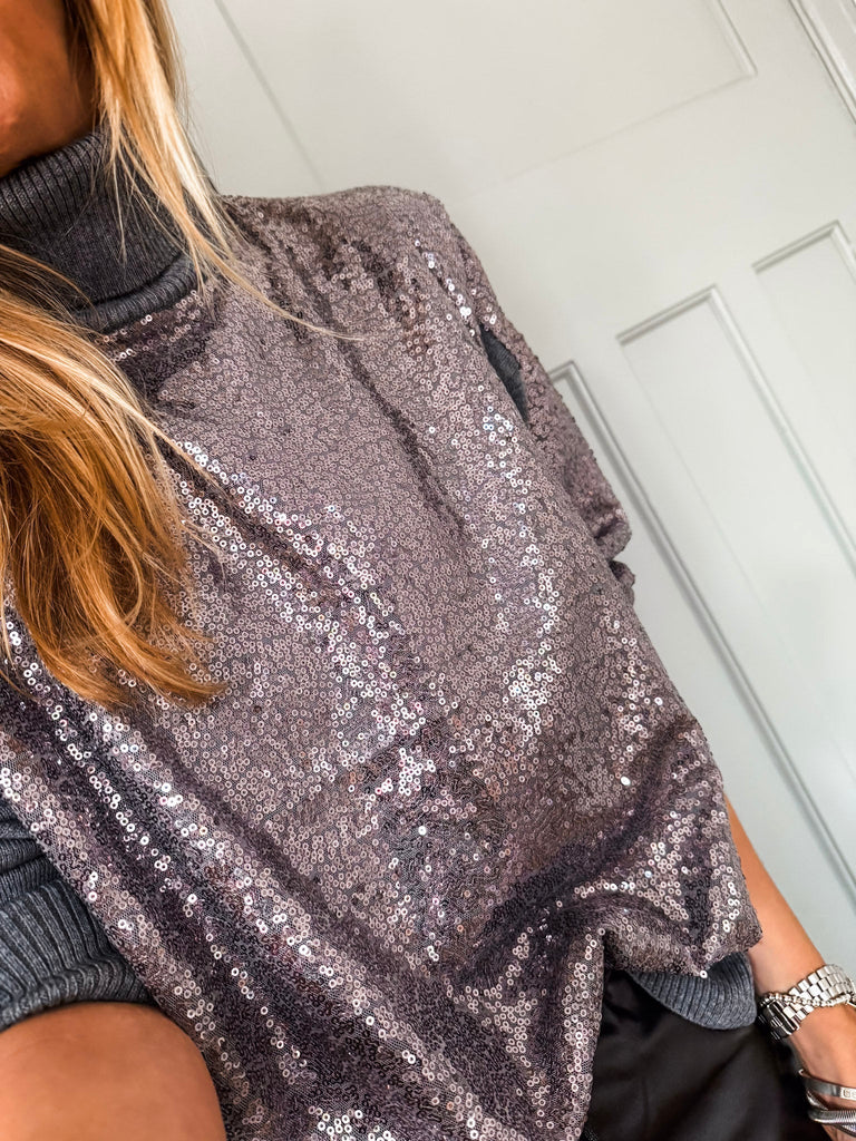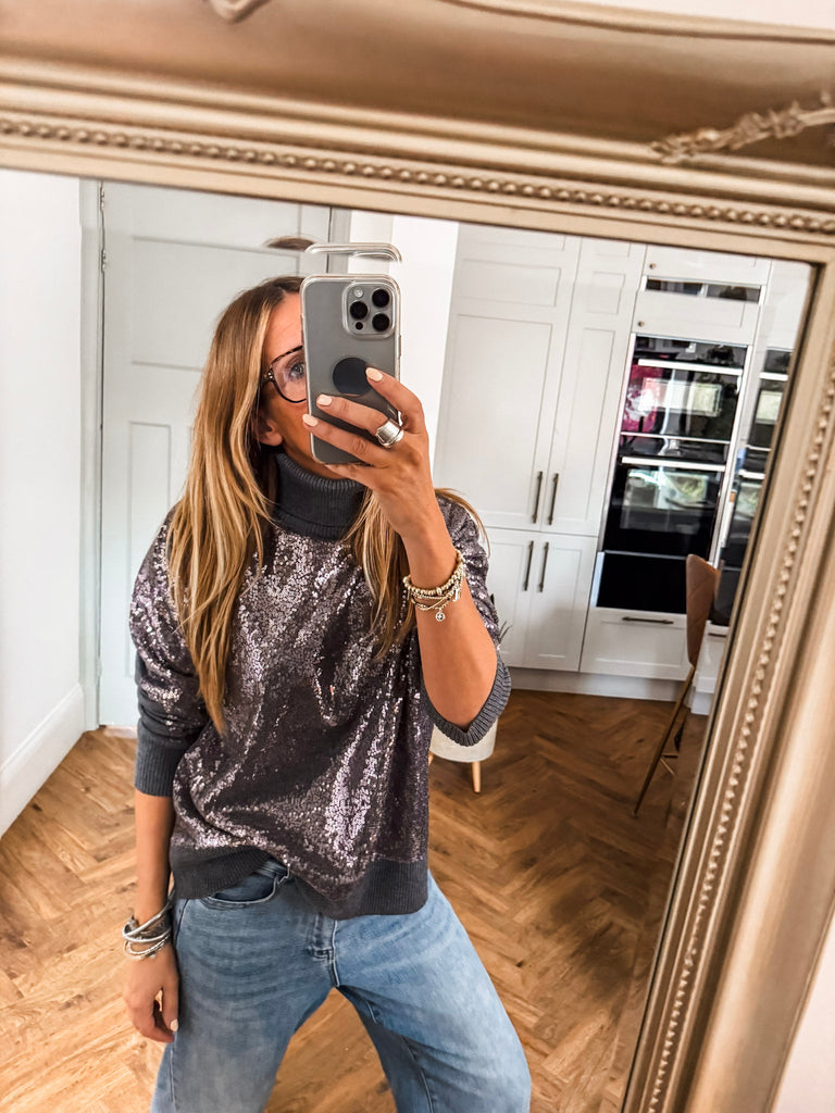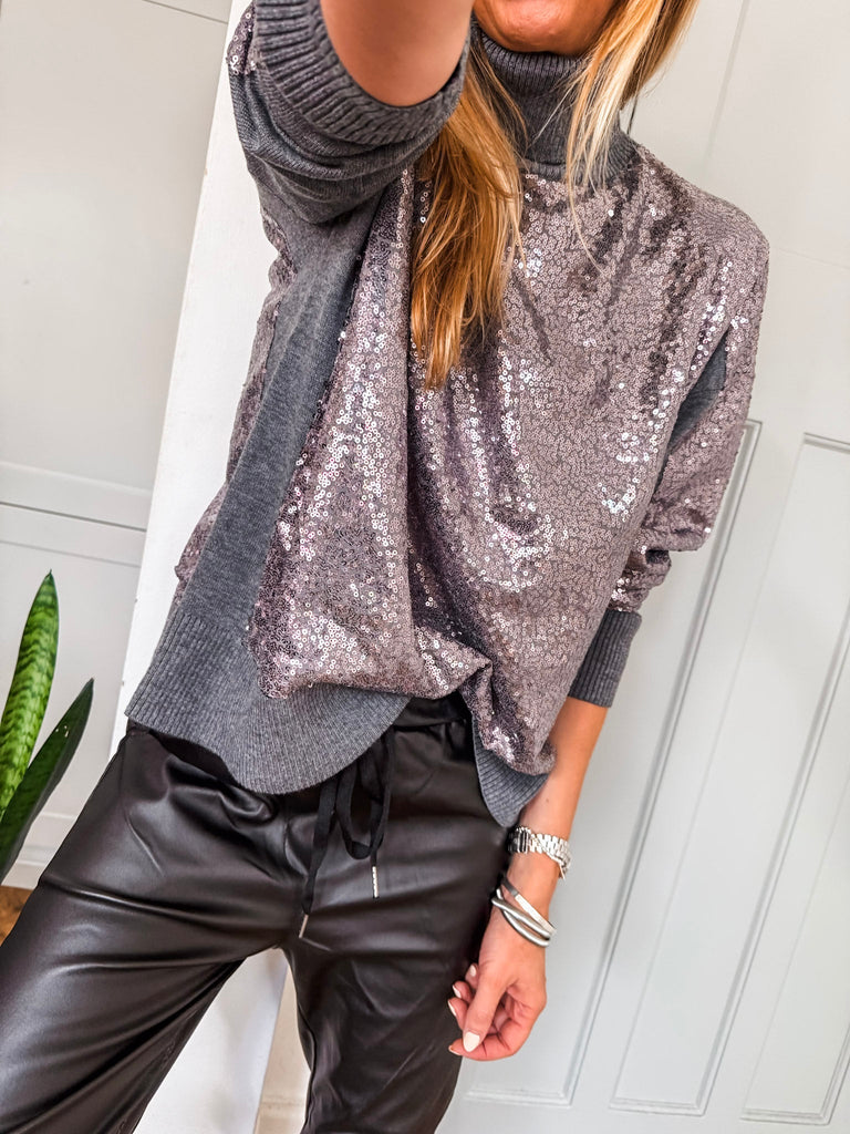 The Hailey Turtleneck is a wool mix jumper in grey featuring a sequin-covered front and back for a touch of sparkle. With long sleeves, a cozy turtleneck, and an oversized fit, this hip-length piece transitions effortlessly from day to evening, adding a chic, eye-catching element to any outfit.