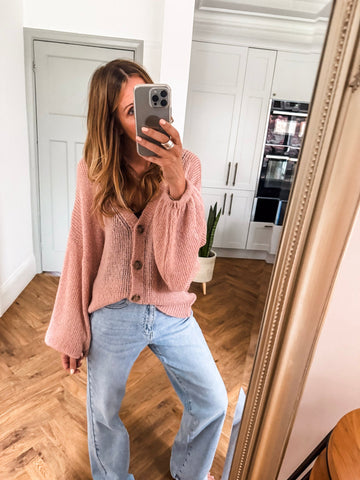 Layer the Balloon Sleeve Button Cardigan over a fitted tank and wide-leg jeans for a relaxed, on-trend look. Wear it buttoned up with a midi skirt and boots for an elevated everyday outfit. Add bold earrings or a structured bag to complete the vibe.