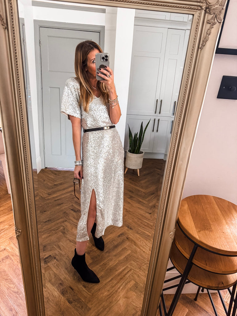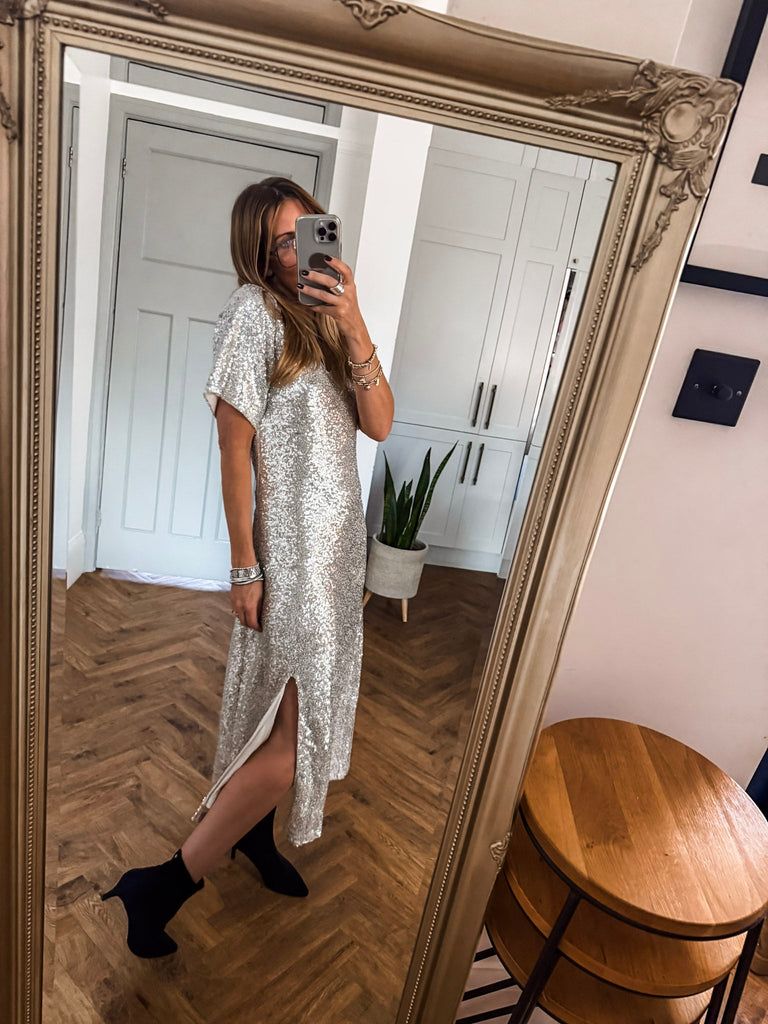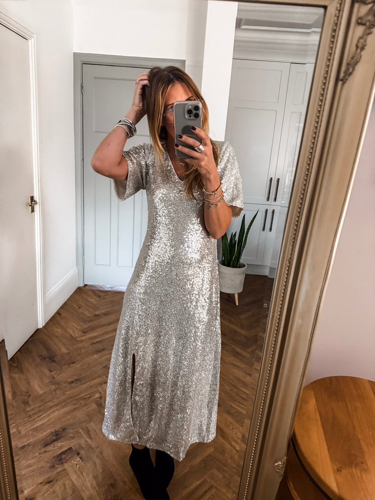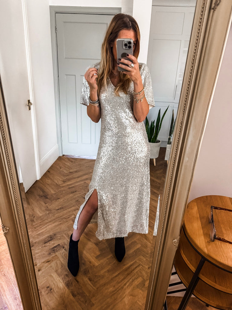 Shine effortlessly in the ICHI Fauca Dress, where subtle elegance meets statement sparkle. With a flattering V-neckline, cap flare sleeves, and a sleek side split, it’s designed to move beautifully with you. The perfect choice for making an entrance with effortless confidence. Style this with a belt and heels!