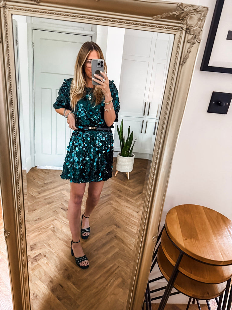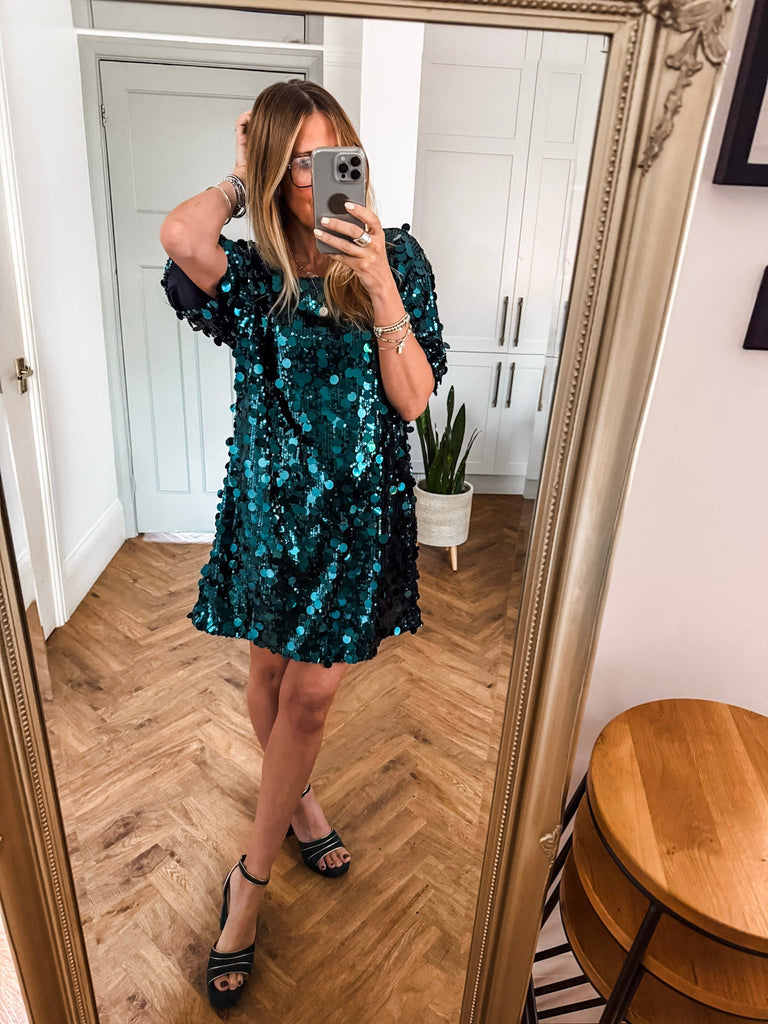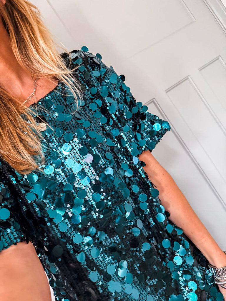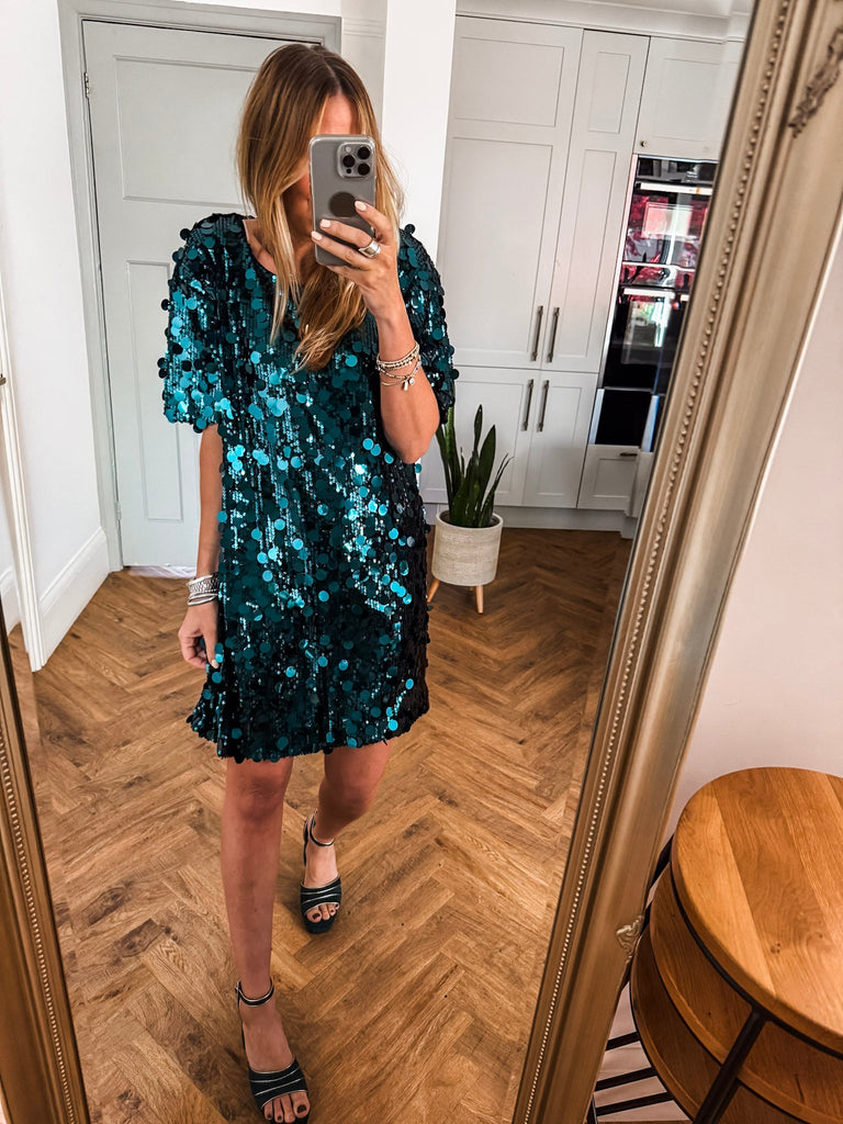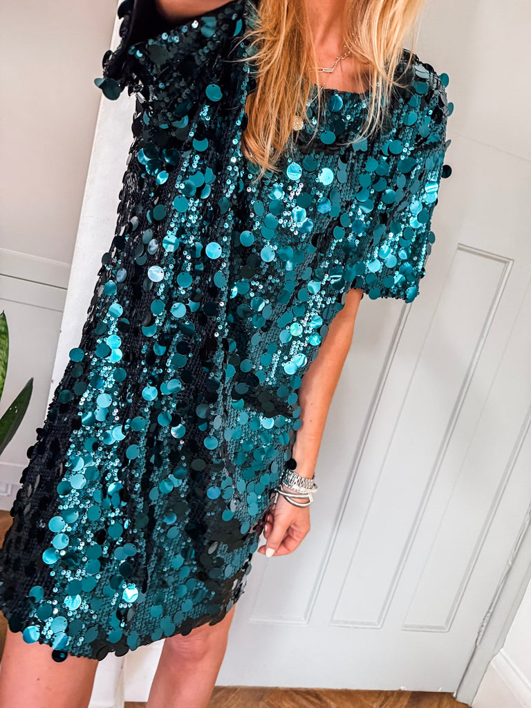 Shine with confidence in this dazzling disc sequin mini dress. Designed with a figure-flattering elasticated waist and effortless short sleeves, it combines comfort with statement style. Finished with a sleek hem for a touch of modern allure, it’s made to turn heads at every occasion. Looks fab paired with a belt and your favourite heels!