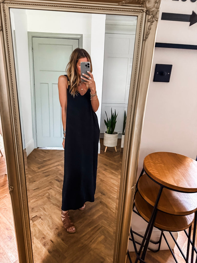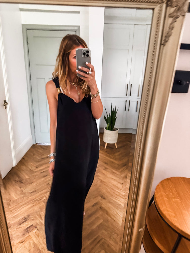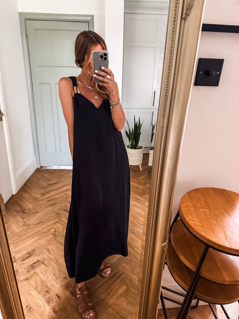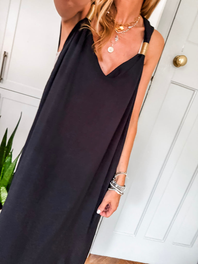 Radiate effortless elegance in the Golden Hour Maxi Dress, designed with a fluid silhouette and a flattering deep V neckline. Subtle gold accents catch the light for a refined touch of shimmer. Perfectly polished yet easy to wear, it’s your go-to for elevated everyday moments or special evenings out.