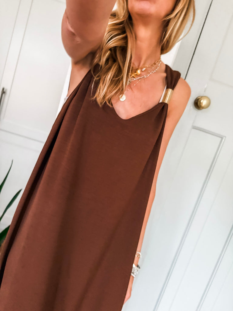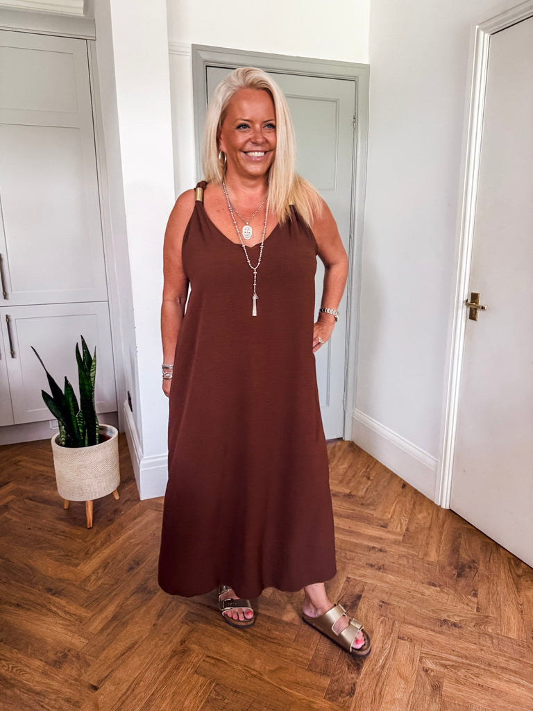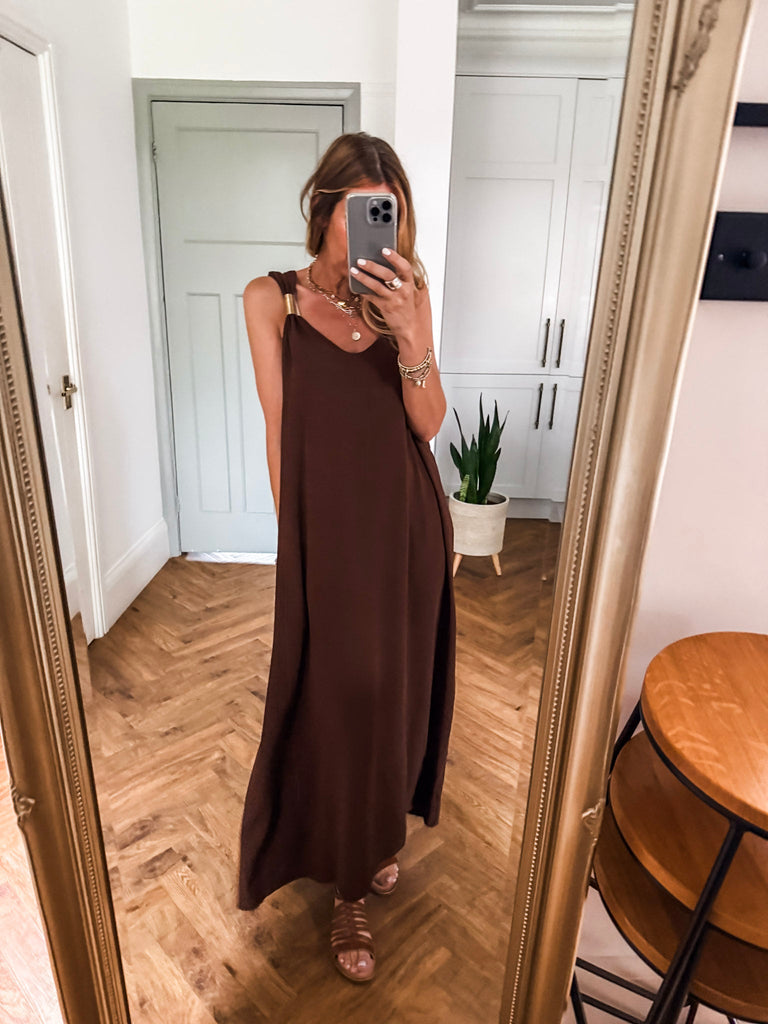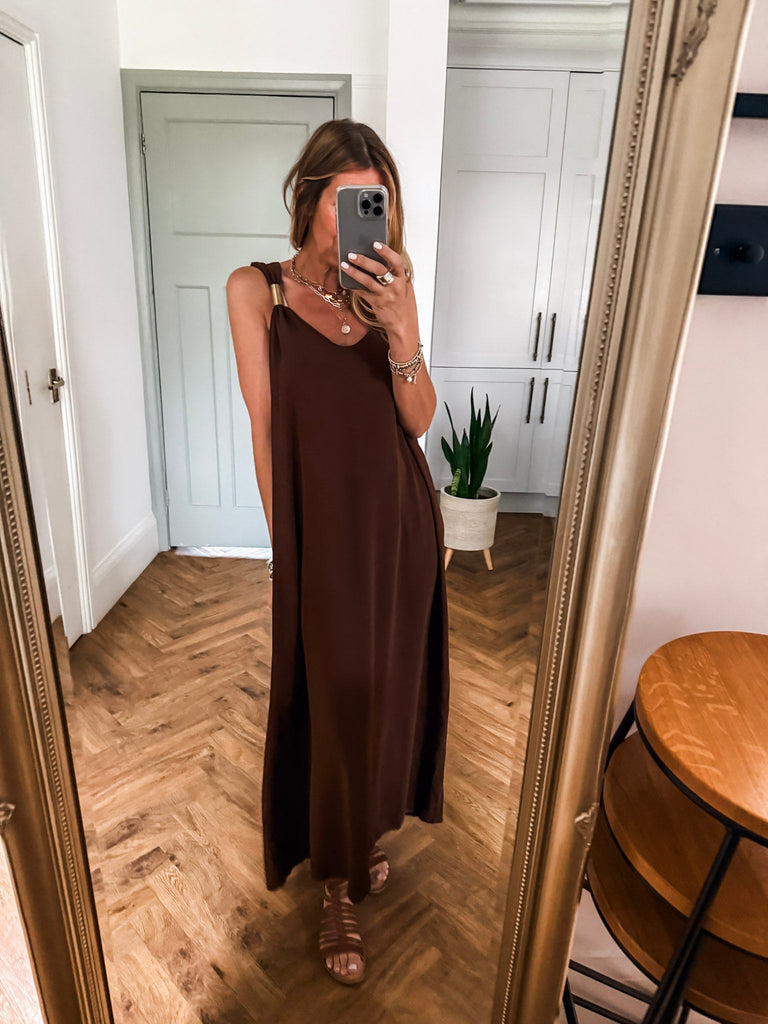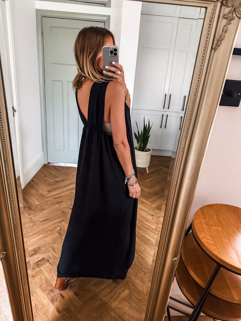 Radiate effortless elegance in the Golden Hour Maxi Dress, designed with a fluid silhouette and a flattering deep V neckline. Subtle gold accents catch the light for a refined touch of shimmer. Perfectly polished yet easy to wear, it’s your go-to for elevated everyday moments or special evenings out.