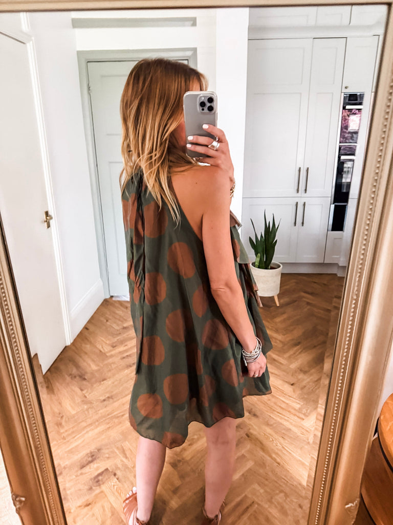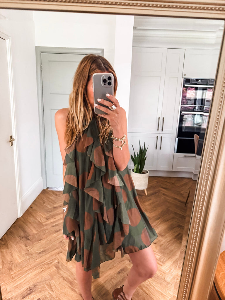 Step into effortless style with this bottle green dress and brown polka dots. Crafted from a lightweight, flowy fabric, it features a sleeveless, loose-fitting silhouette that drapes beautifully for all-day comfort. The high neckline is accented with a delicate front ruffle and a tie-back bow, adding a touch of elegance to its playful design. Perfect for warm days or layered looks, this dress strikes the perfect balance between fun and sophistication.