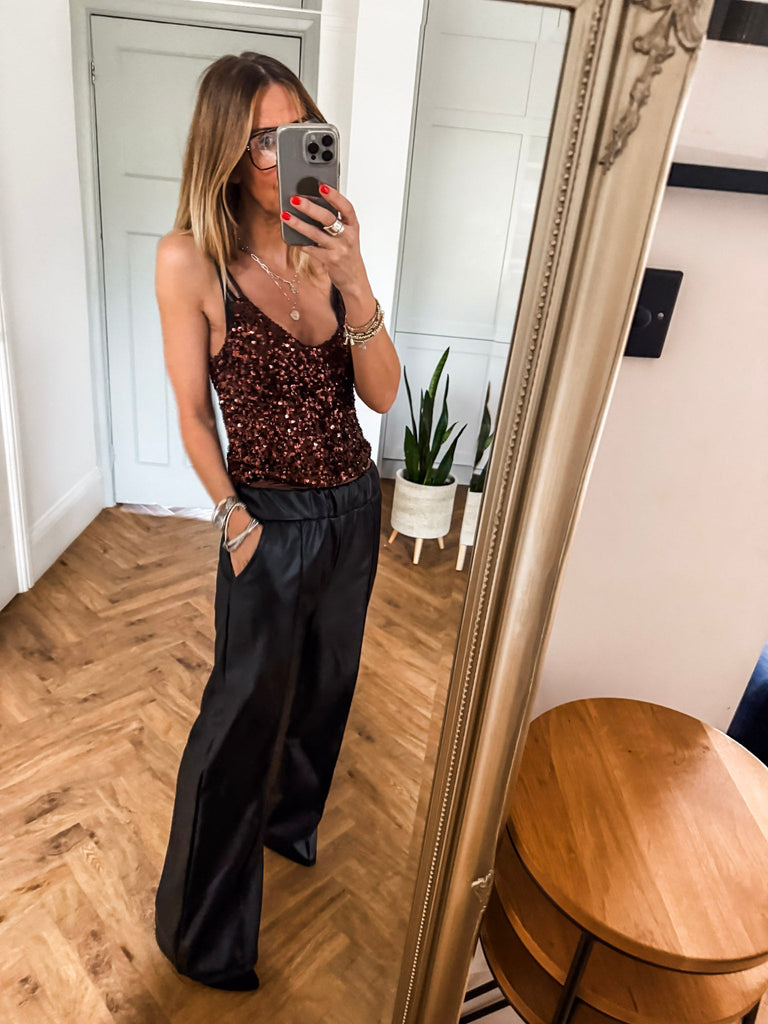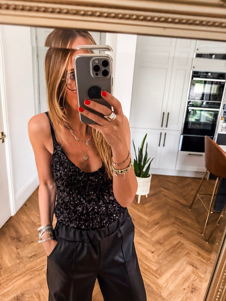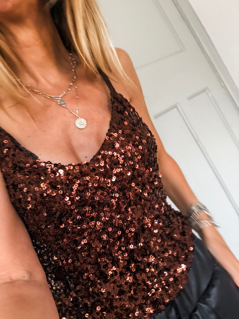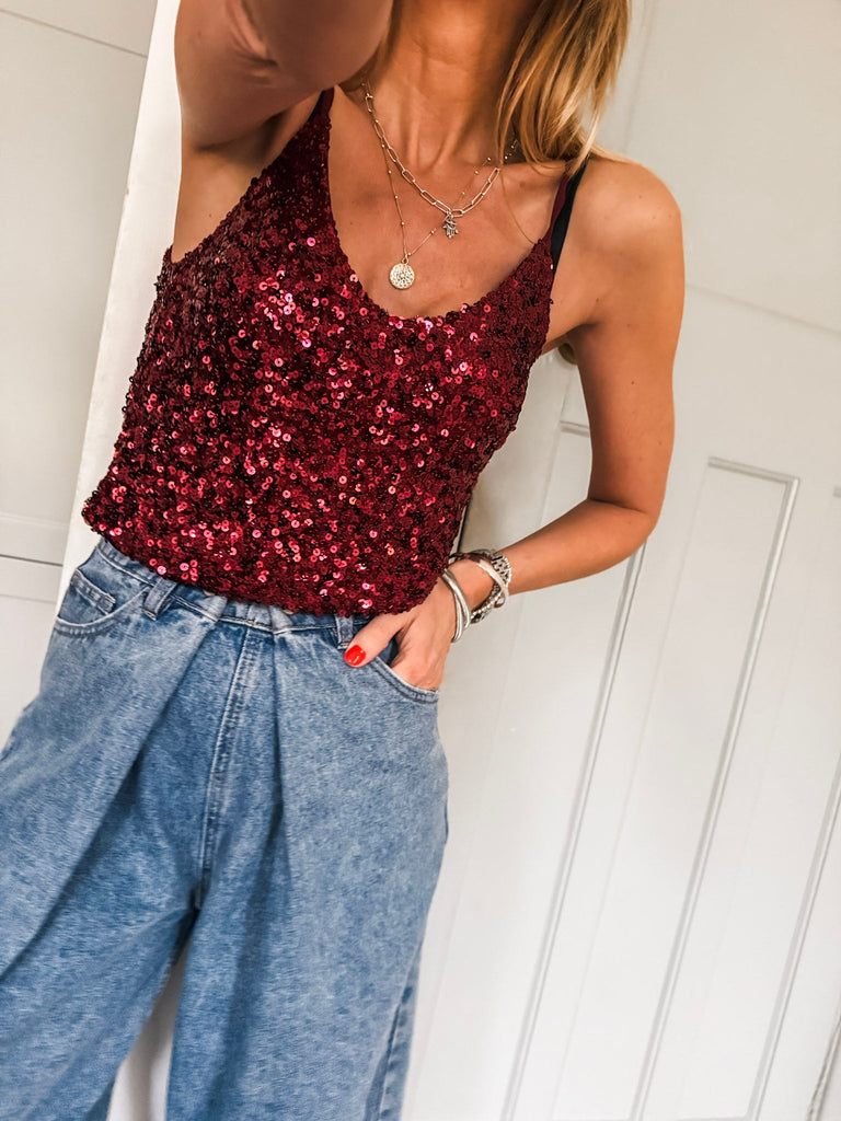Designed with a flattering v-neck, adjustable straps and embellished with sequins. This is perfect styled with jeans, tailored trousers and skirts for the party season. Fabric is stretchy and will fit up to a size 14.