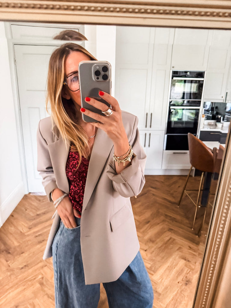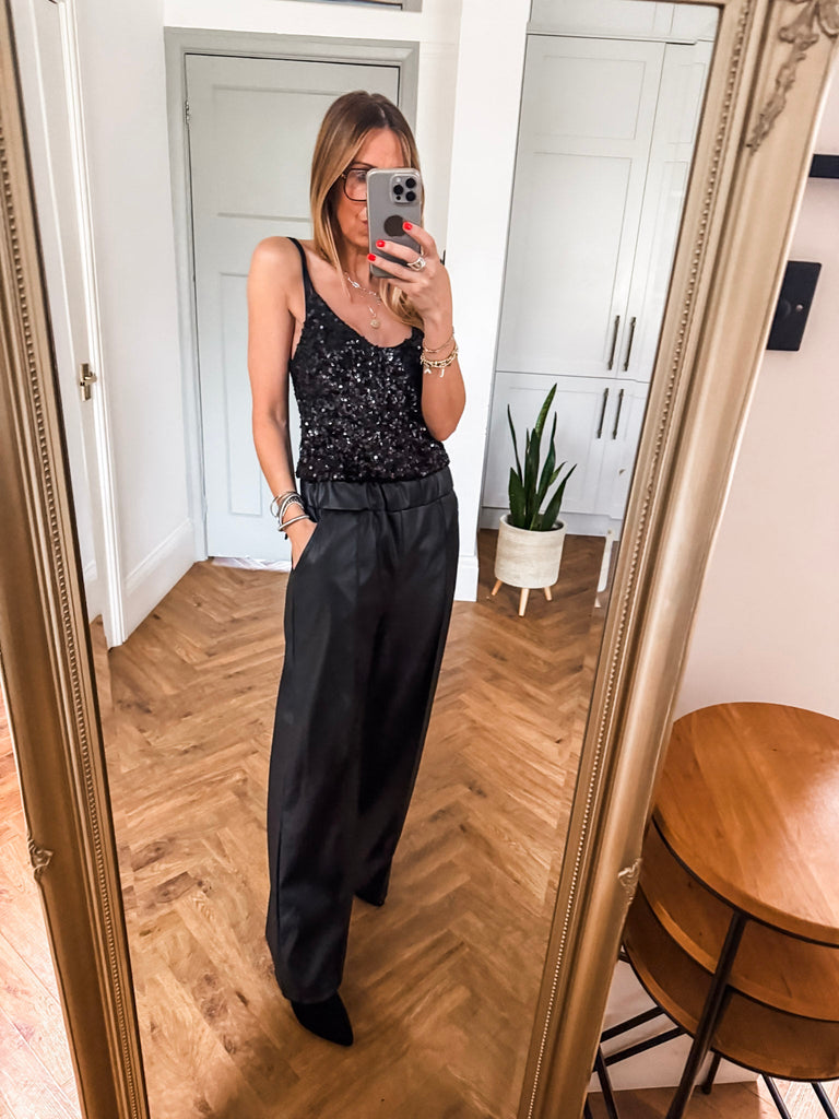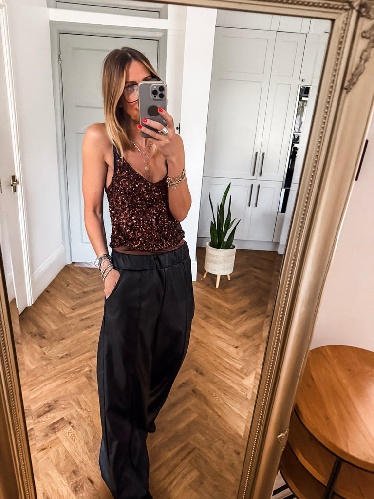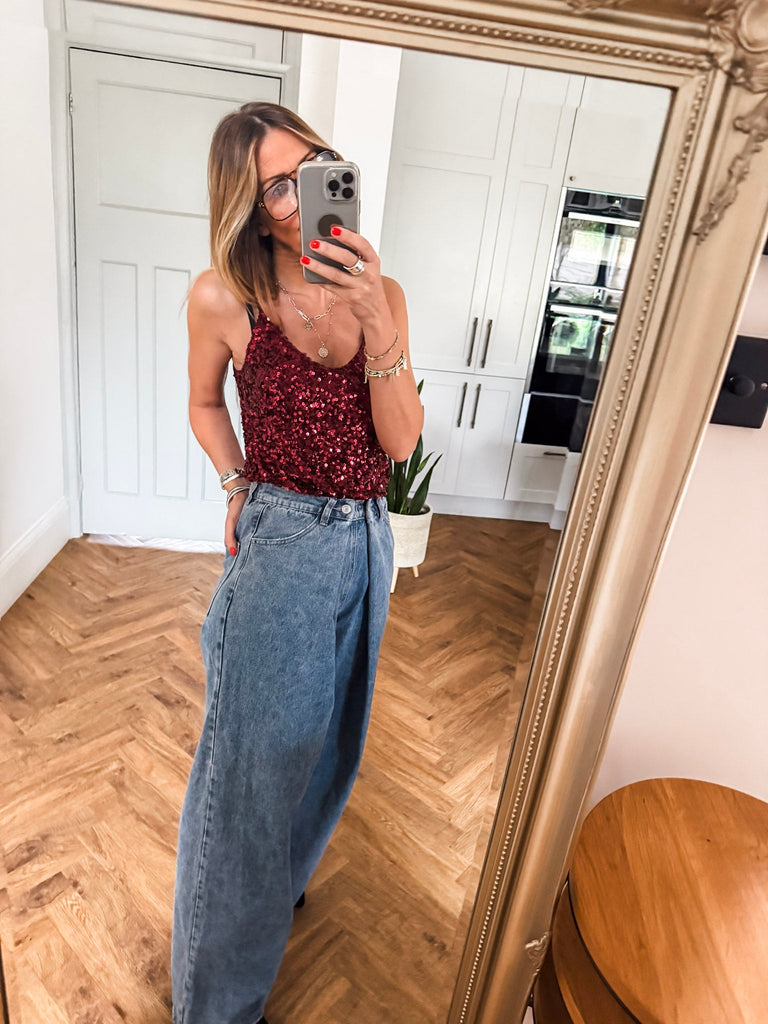 Designed with a flattering v-neck, adjustable straps and embellished with sequins. This is perfect styled with jeans, tailored trousers and skirts for the party season. Fabric is stretchy and will fit up to a size 14.