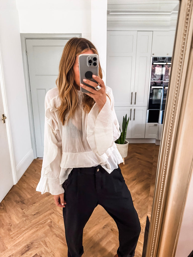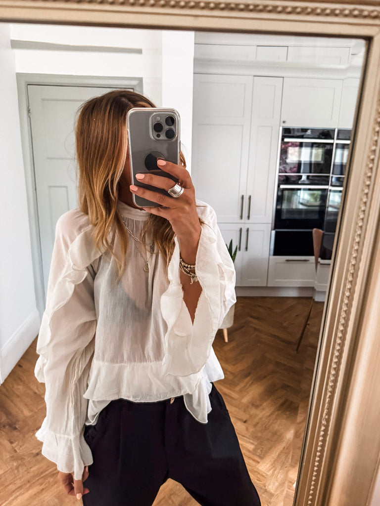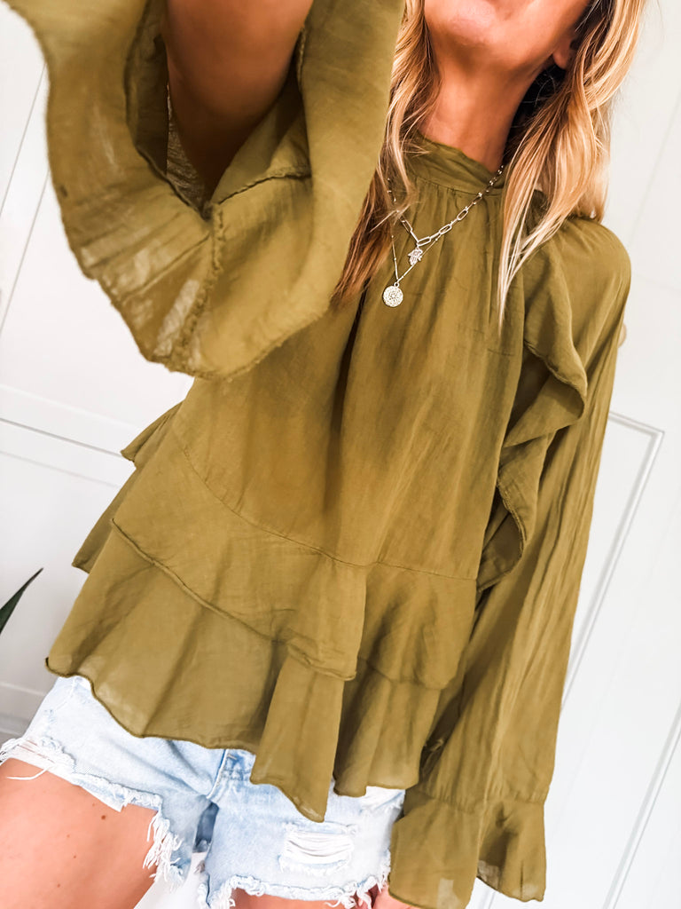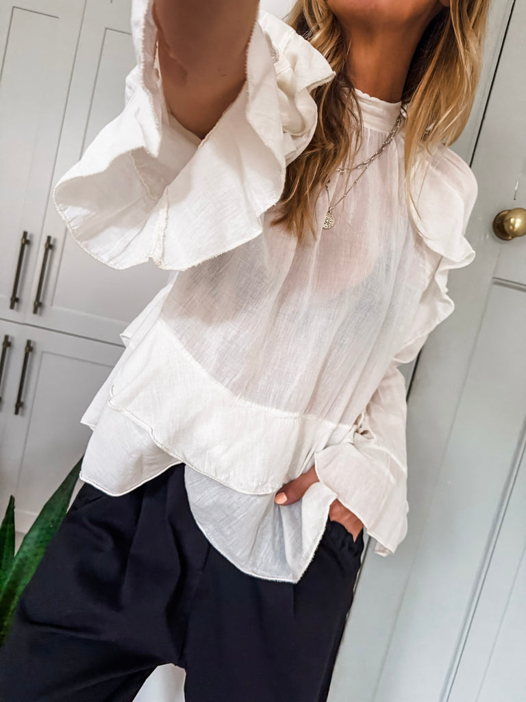 This top is a lightweight, airy blouse made from a sheer fabric. It features a high neckline that adds a touch of elegance and has a tie at the back. The sleeves are long and loose with frills running down them, giving a soft, romantic vibe. The hemline also has a frilled, layered design, adding movement and texture to the piece. The fabric has a delicate, slightly crinkled texture.
