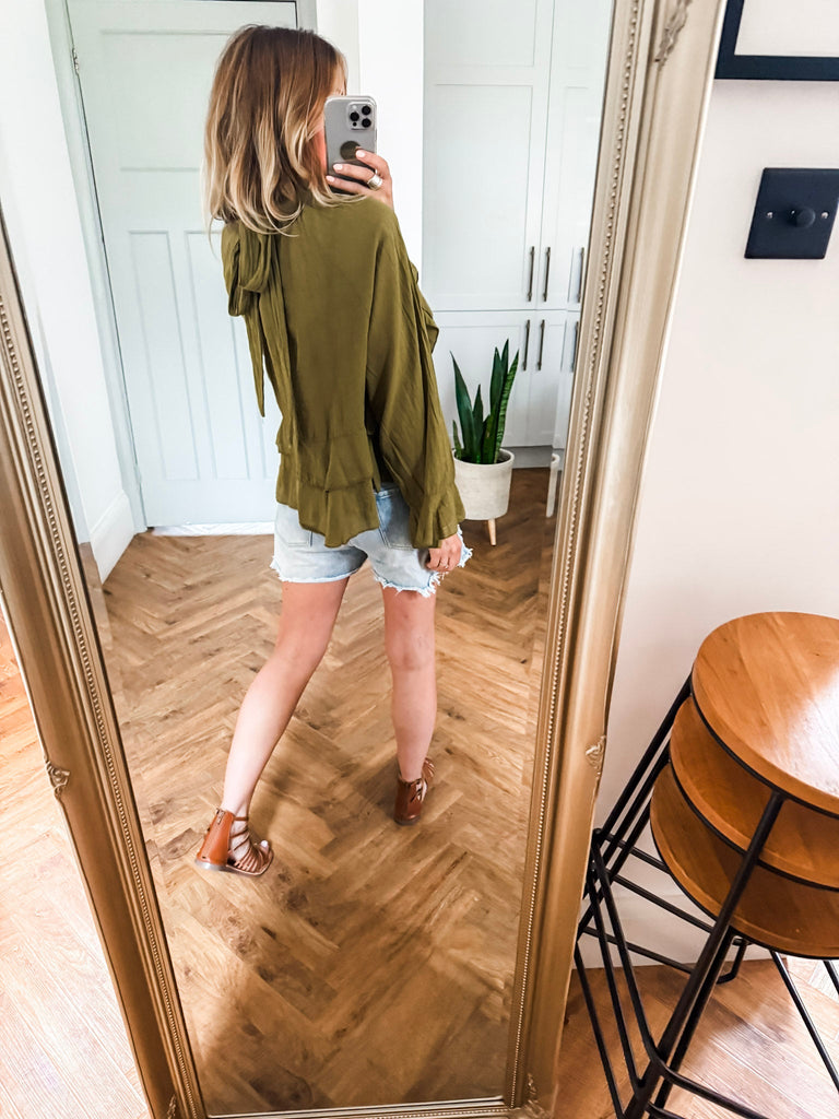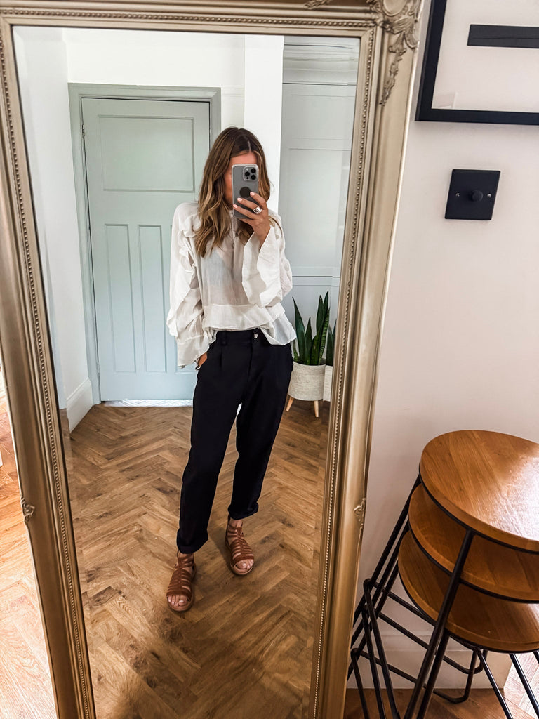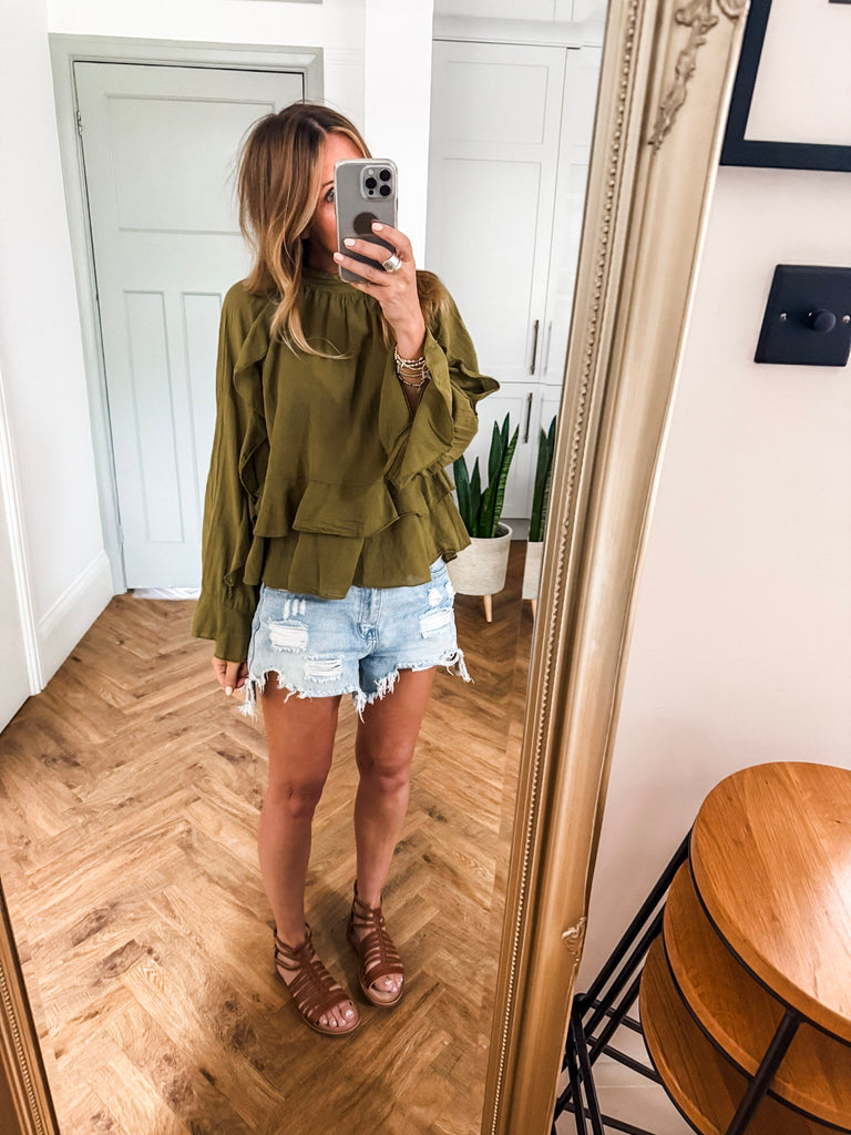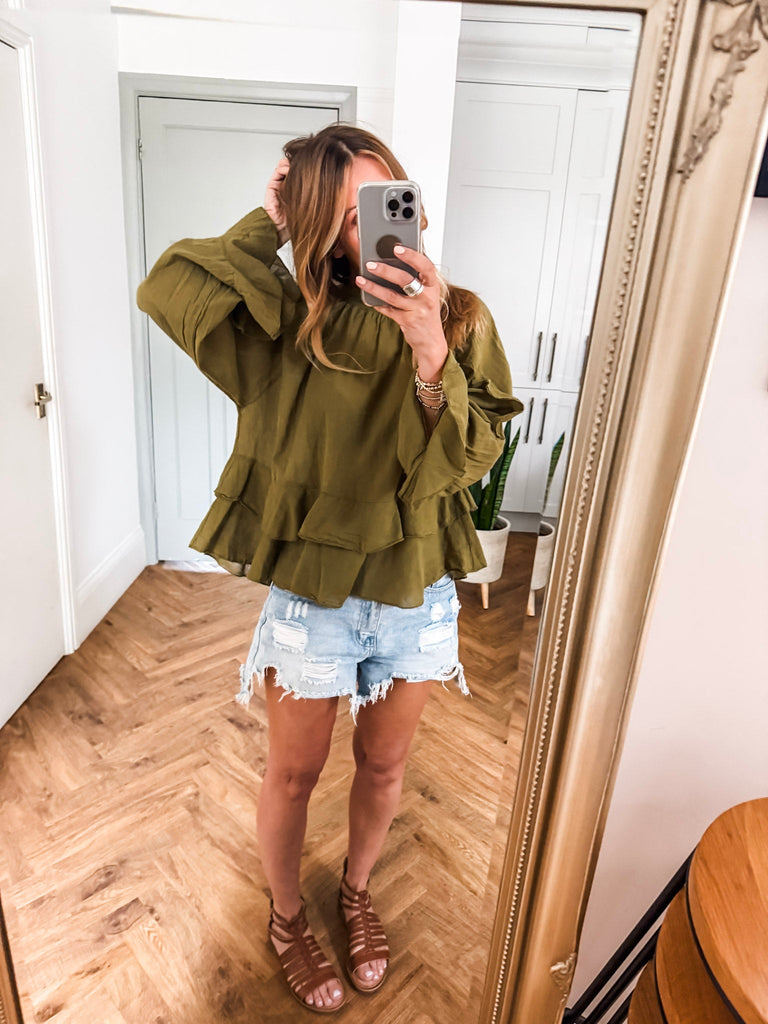 This top is a lightweight, airy blouse made from a sheer fabric. It features a high neckline that adds a touch of elegance and has a tie at the back. The sleeves are long and loose with frills running down them, giving a soft, romantic vibe. The hemline also has a frilled, layered design, adding movement and texture to the piece. The fabric has a delicate, slightly crinkled texture.