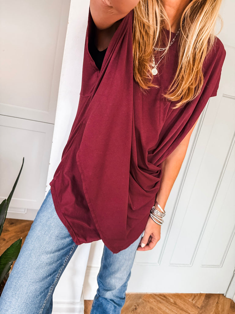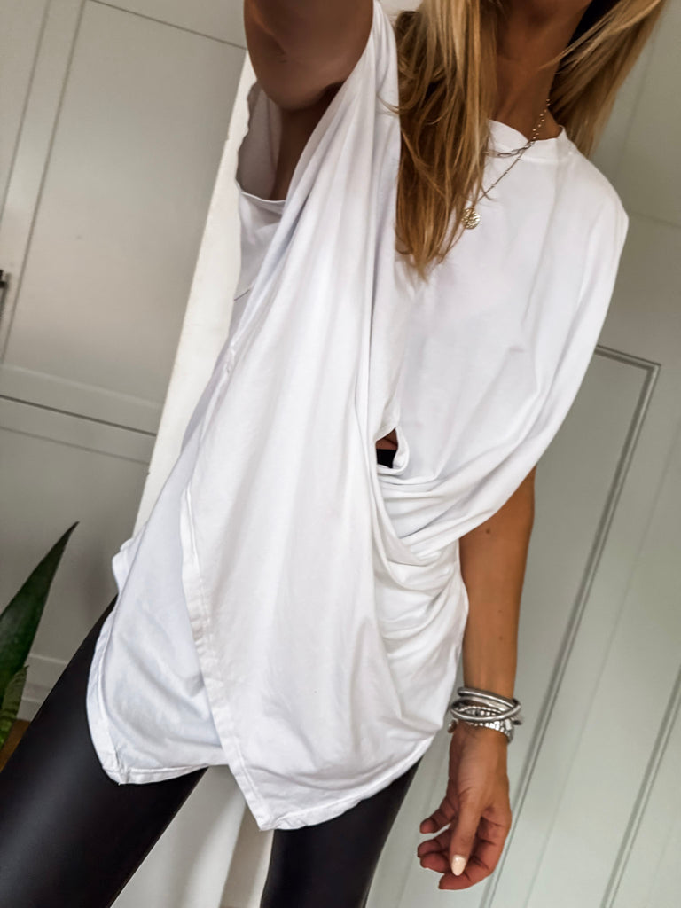 Style your everyday look with this effortlessly cool draped t-shirt. Featuring a relaxed fit, round neck, and flowing front detail, it brings a modern edge to a classic silhouette. Wear it solo or layered—either way, it’s comfort with a statement.