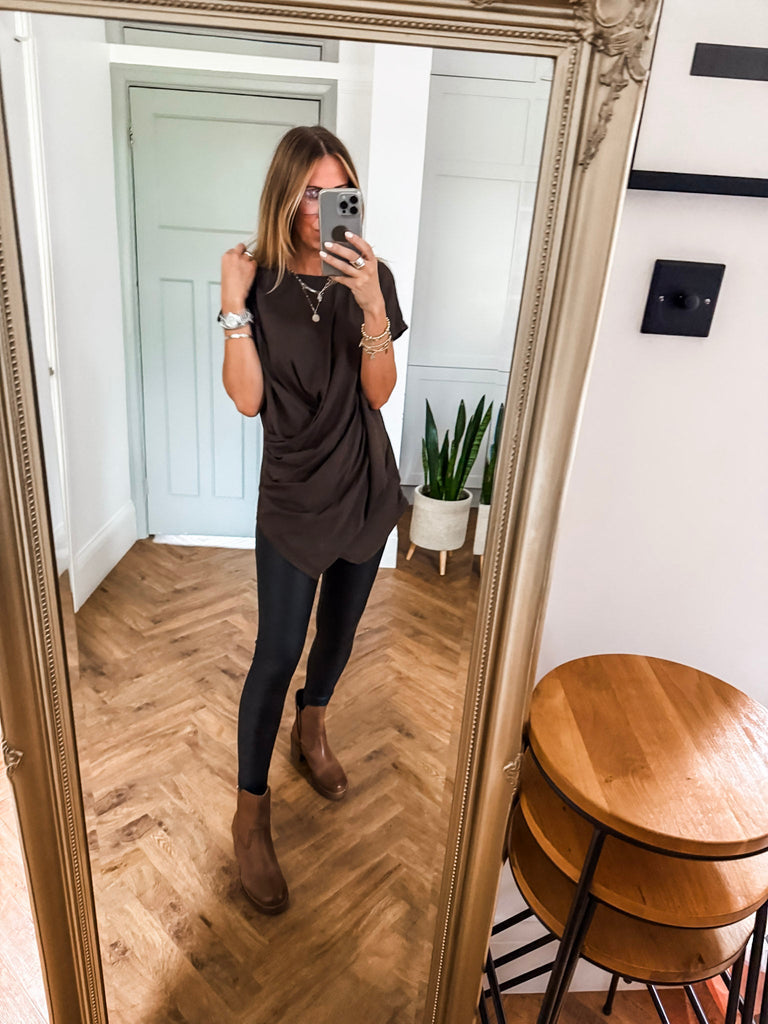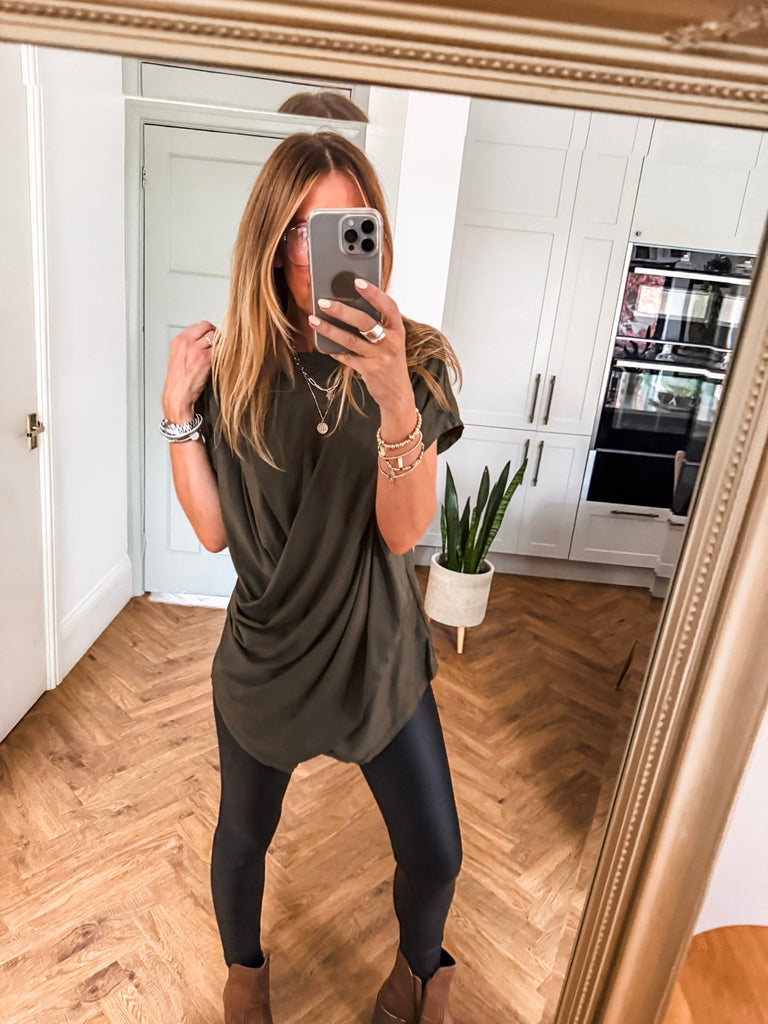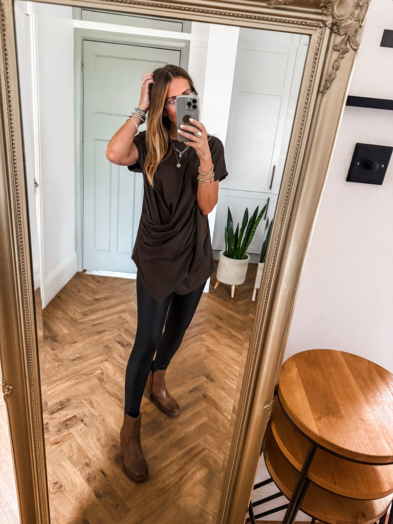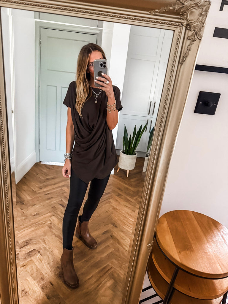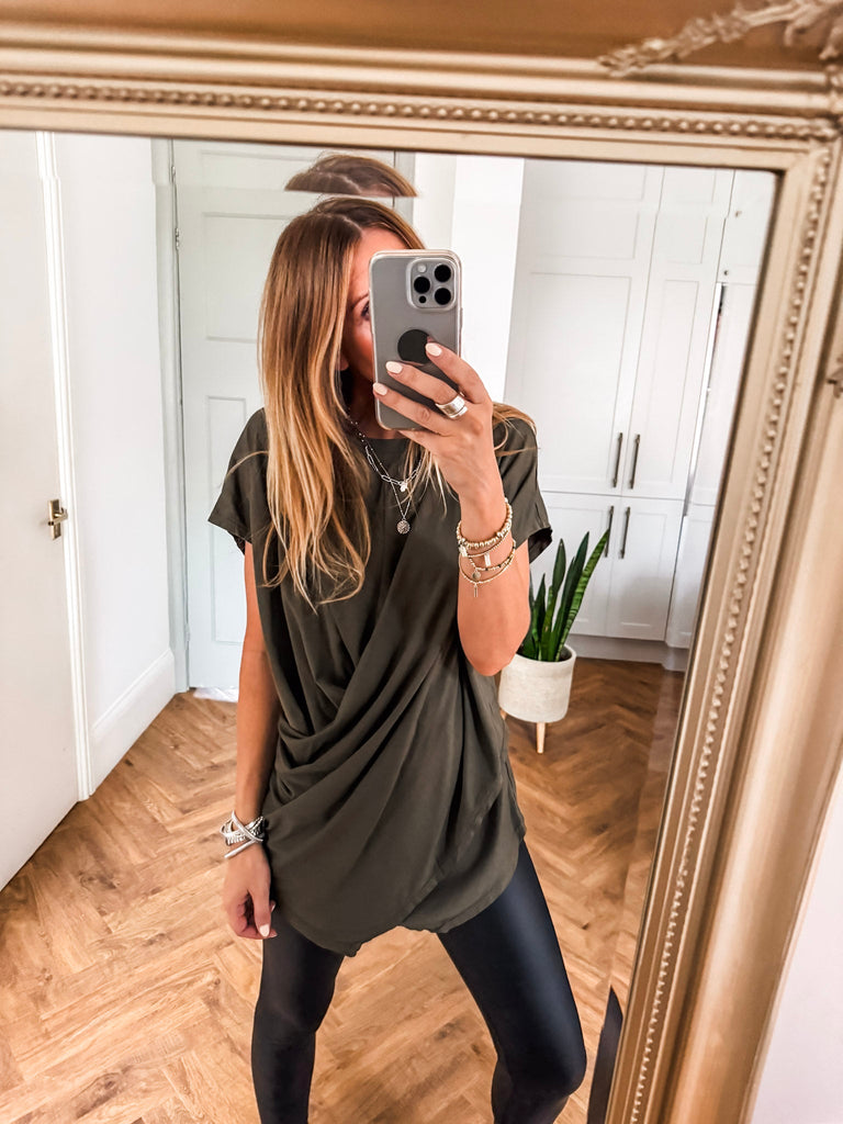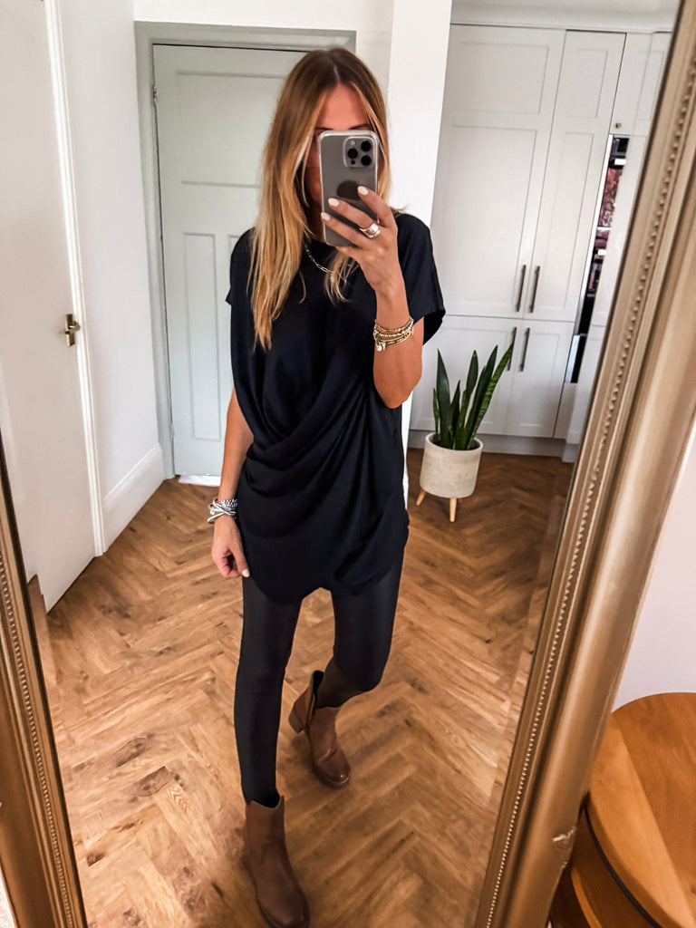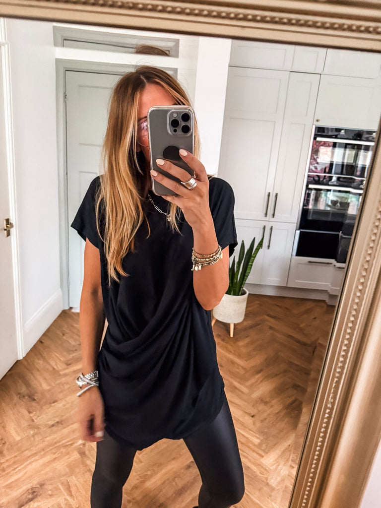 Style it with slim trousers or leggings to balance the draped silhouette. Layer under a blazer for an elevated take or keep it casual with denim and trainers. Add statement earrings to bring a touch of polish to the look.