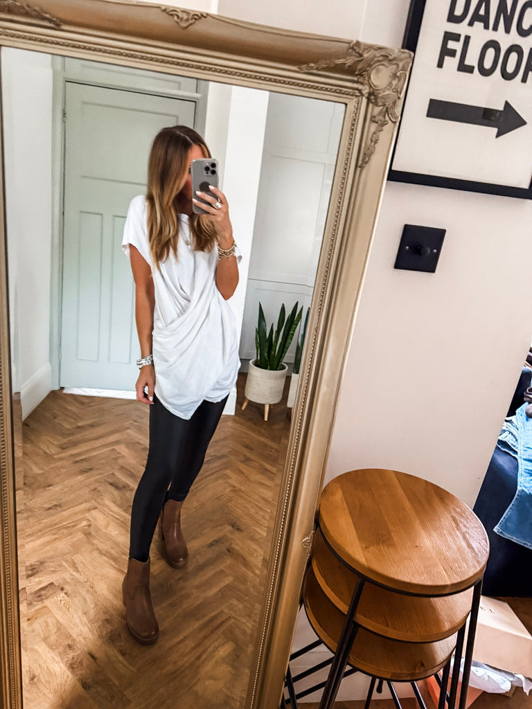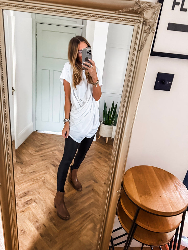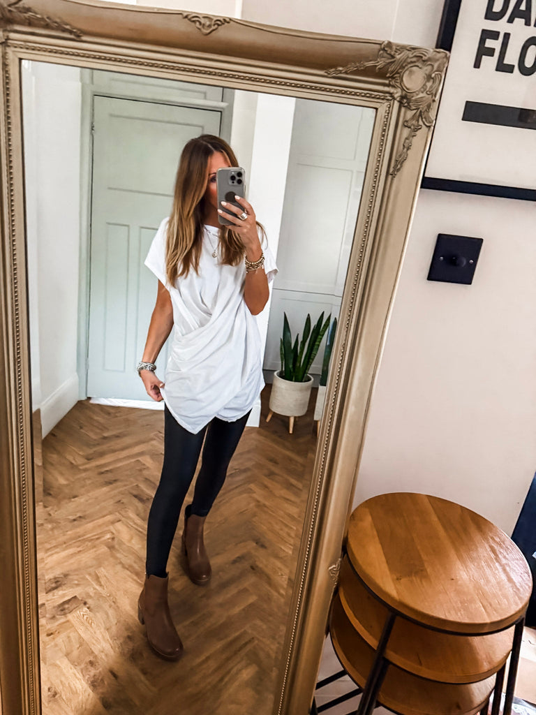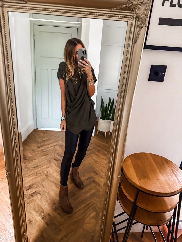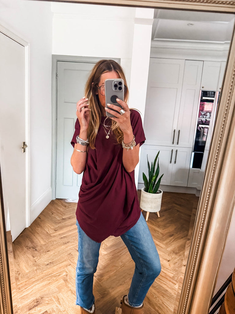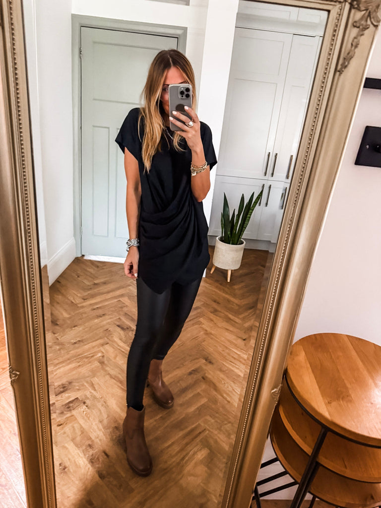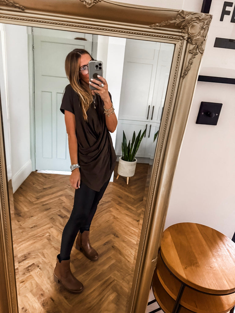 Style it with slim trousers or leggings to balance the draped silhouette. Layer under a blazer for an elevated take or keep it casual with denim and trainers. Add statement earrings to bring a touch of polish to the look.