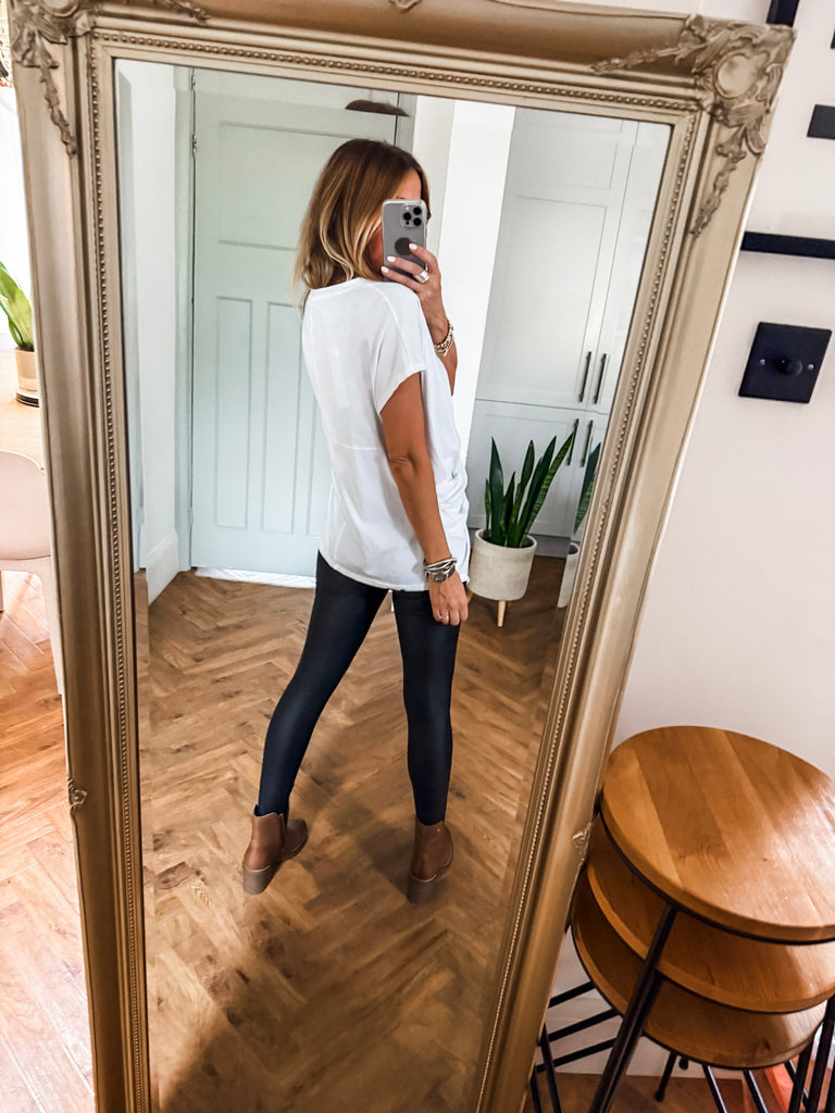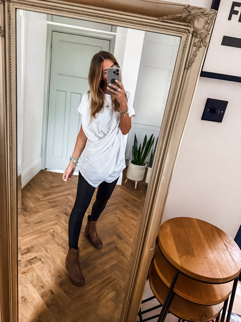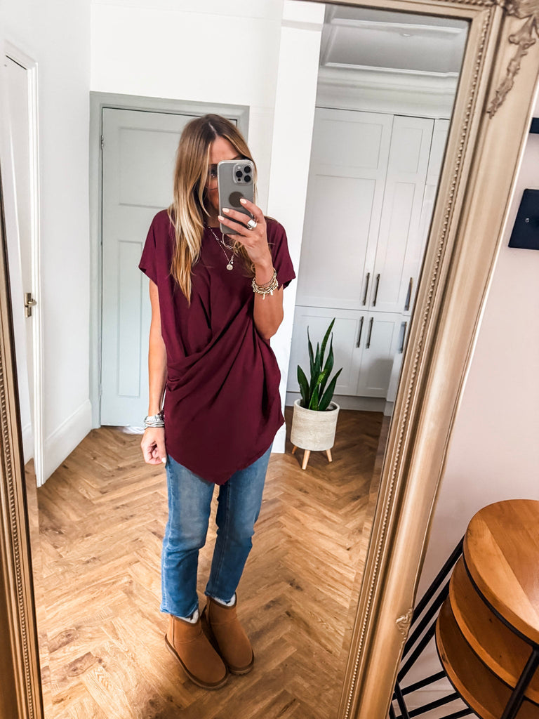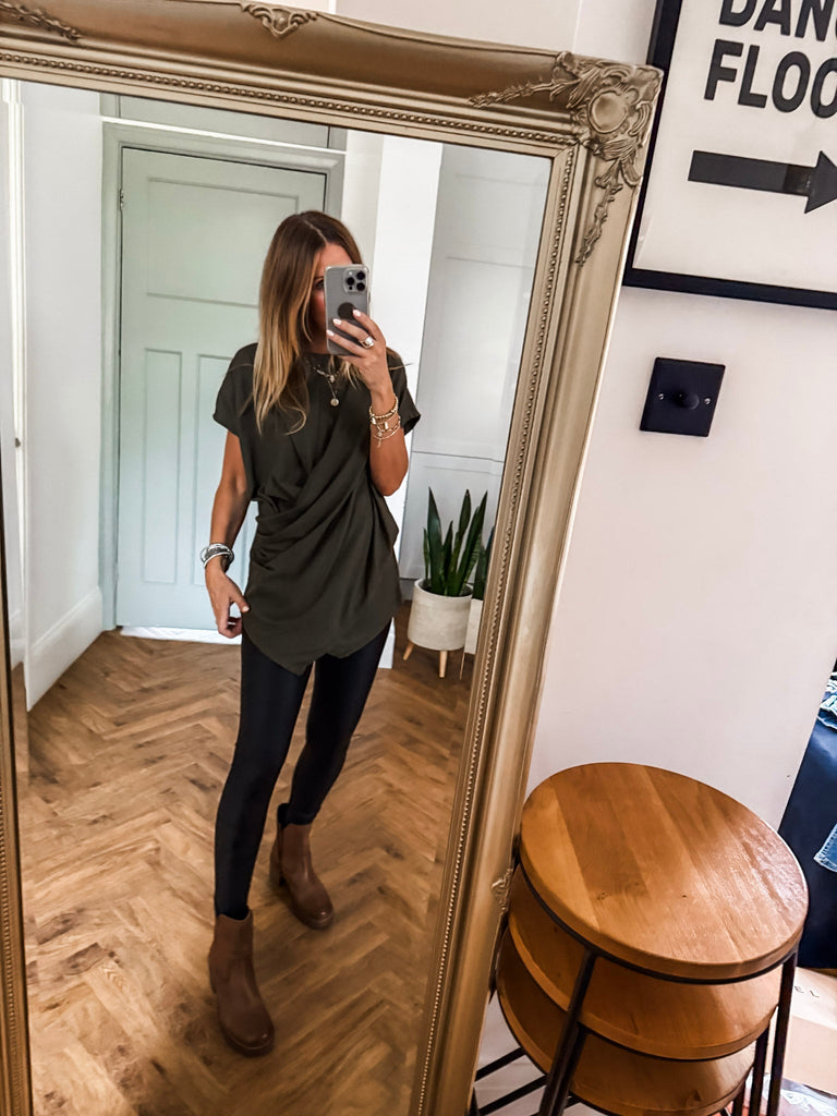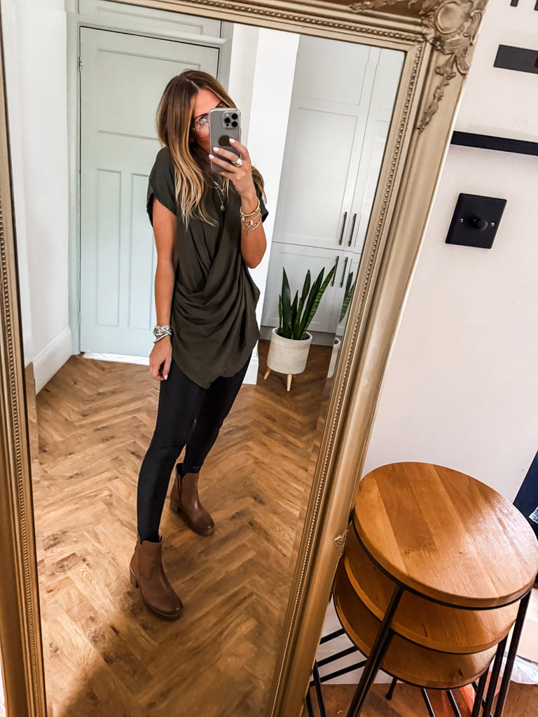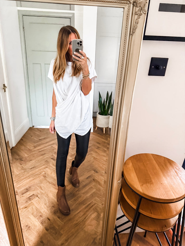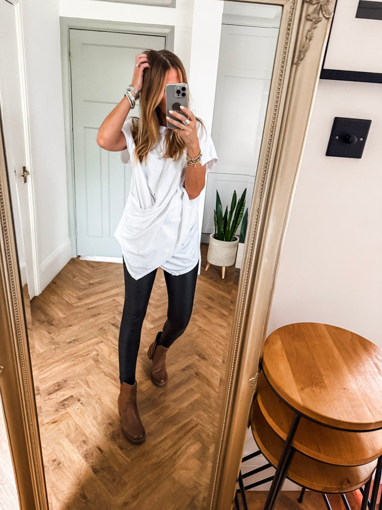 Style it with slim trousers or leggings to balance the draped silhouette. Layer under a blazer for an elevated take or keep it casual with denim and trainers. Add statement earrings to bring a touch of polish to the look.