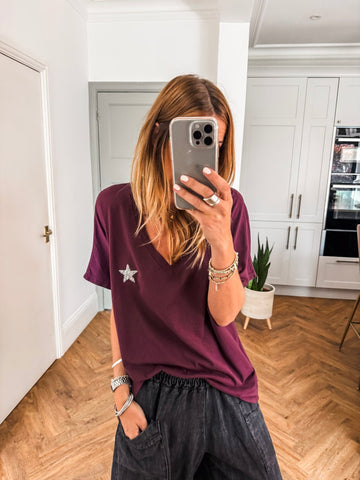 The V Neck Star T-Shirt blends laid-back comfort with a hint of sparkle. Its relaxed fit and soft fabric make it an everyday essential, while the subtle glitter star adds a cool, understated edge. Effortless style made to shine, day or night.