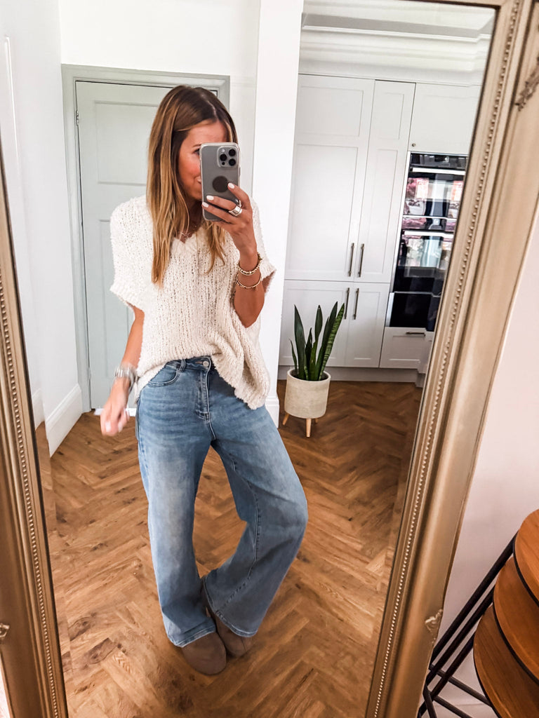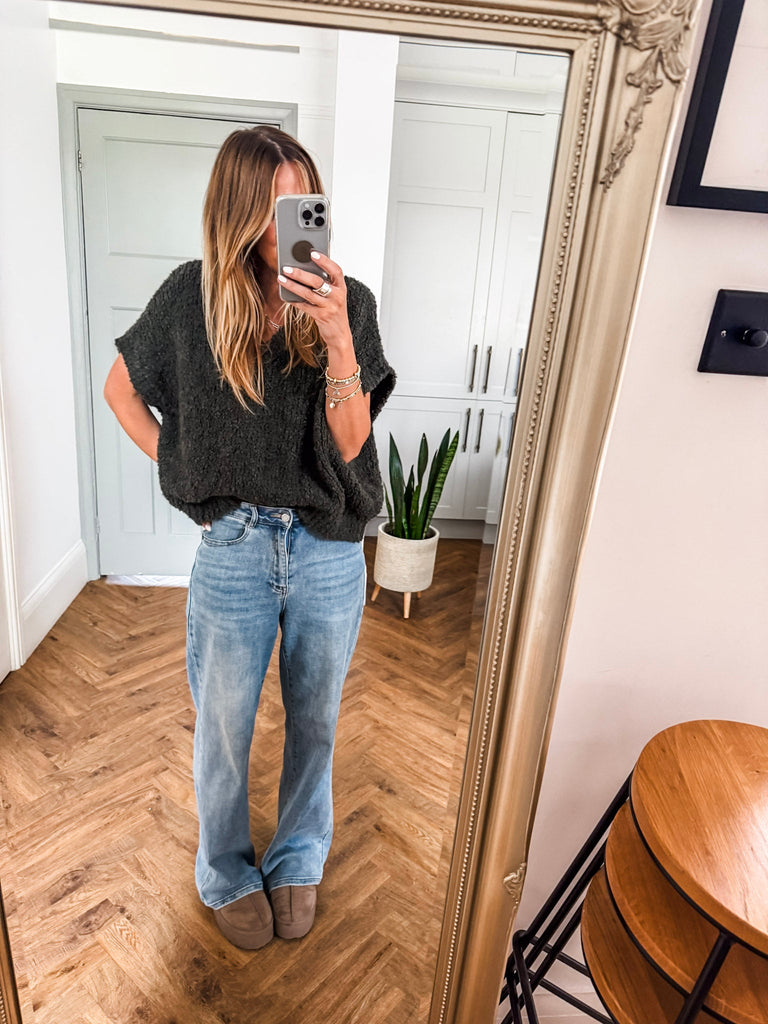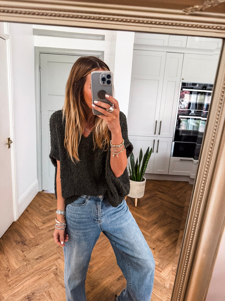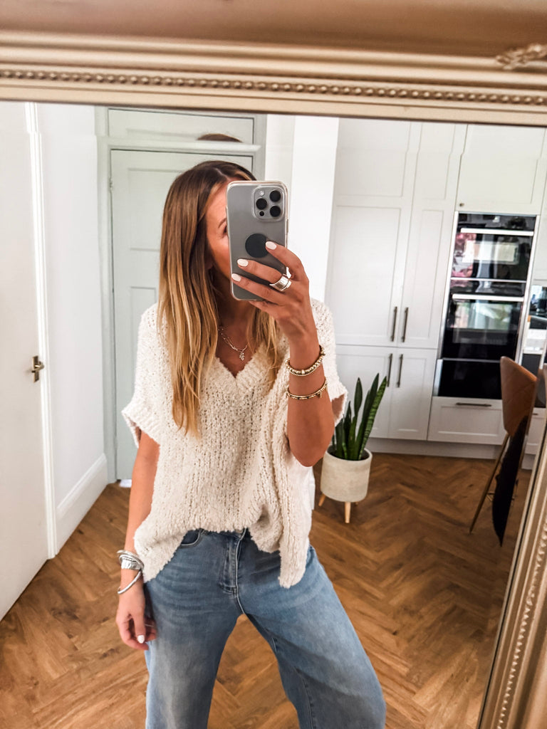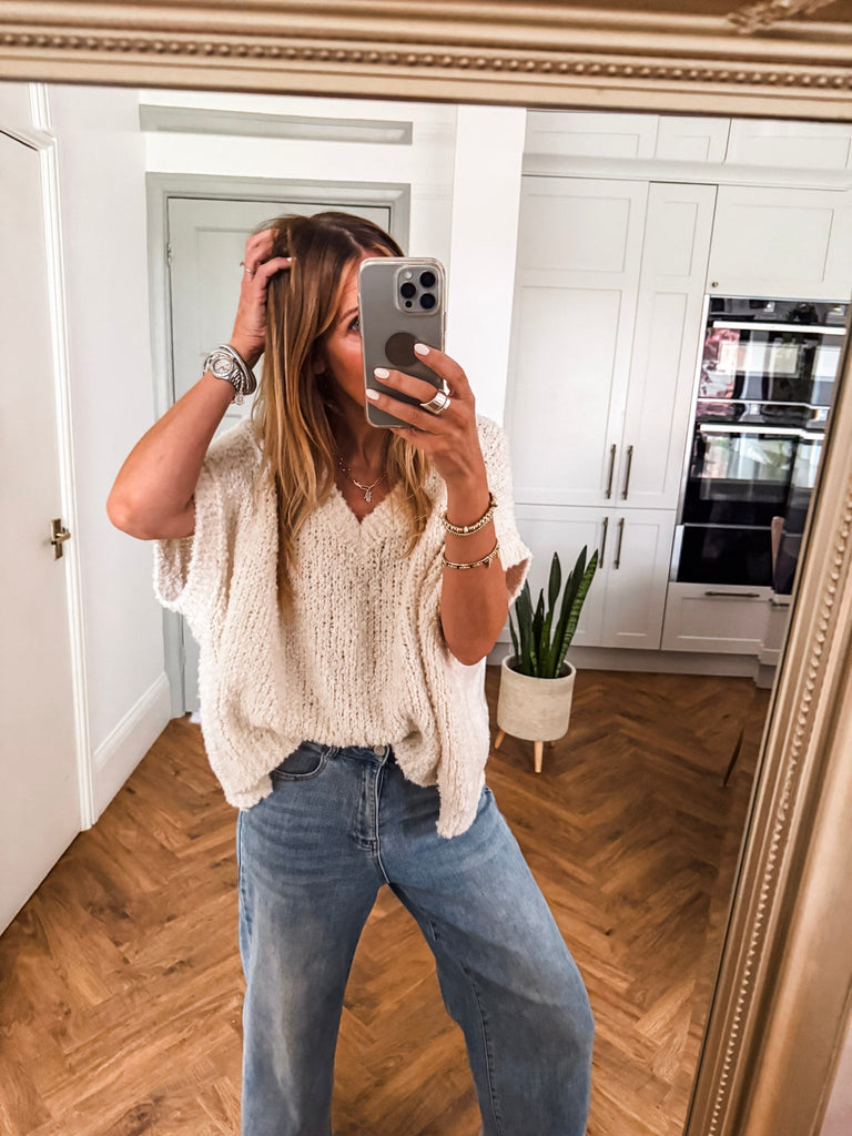 The V Neck Boucle Short Sleeve Jumper blends a relaxed, oversized fit with soft, textured boucle for effortless style. Featuring a flattering V-neck and airy short sleeves, it’s perfect for layering or wearing solo. A modern wardrobe staple with just the right balance of comfort and polish.